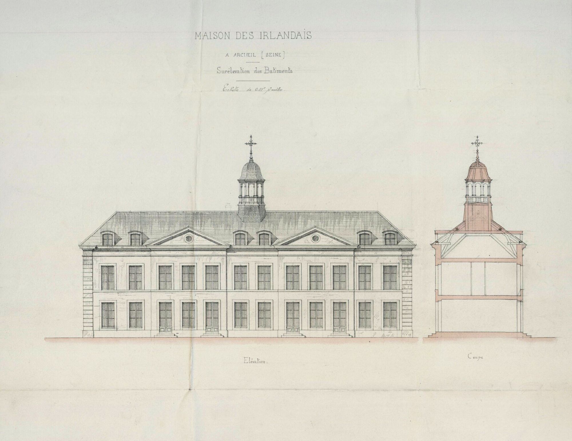 - the country house at Arcueil, with a manuscript estate survey, in ink and wash, of the buildings, courtyards, gardens and parklands that comprised the Collège des Irlandais at Arcueil : Recueil complet avec trois plans et un dessin de la façade de la maison de campagne d'Arcueil avec, sur la première page, une note explicative de Charles Ouin-la-Croix, 1872 (Arcueil, plans, A4.f3).