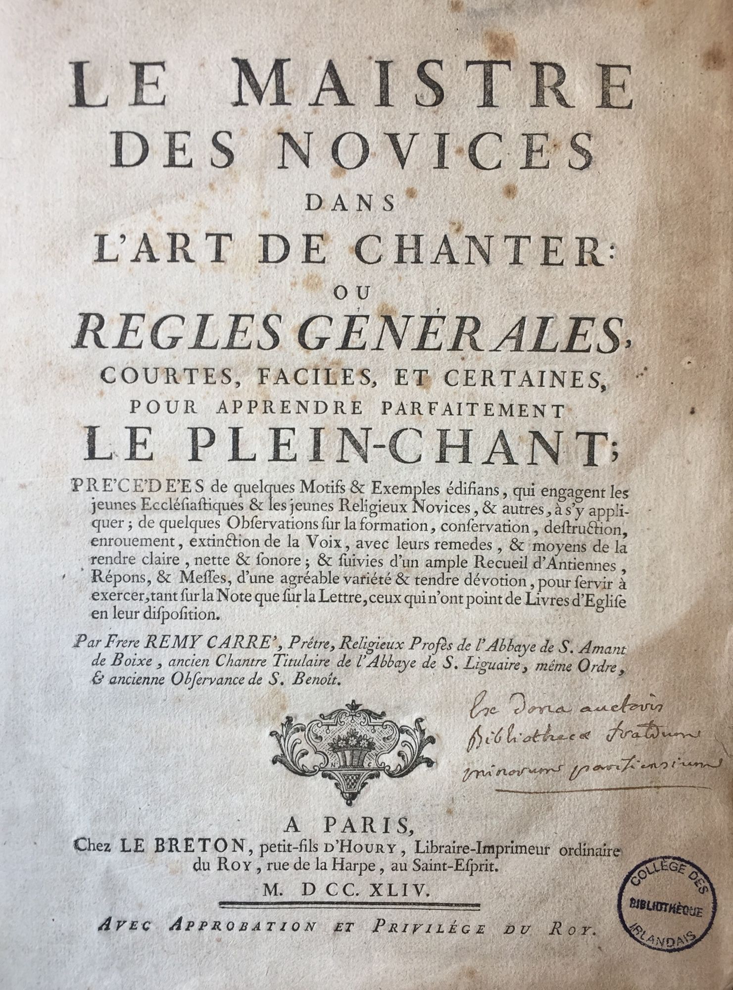 In the eighteenth and nineteenth centuries, a number of books were published to address the dearth of information on the interpretation and performance of chant. Le Maistre des novices dans l'art de chanter ou règles générales, courtes, faciles, et certaines, pour apprendre parfaitement le plein-chant (1744) by Fr Rémy Carré is a typical example of a method which provides information on the history and practice of plainchant. This work was intended for novices and young religious who had no other resource to learn plainchant because they were based at small abbeys or priories in rural areas where they did not have the guidance of professionally trained musicians/cantors.
