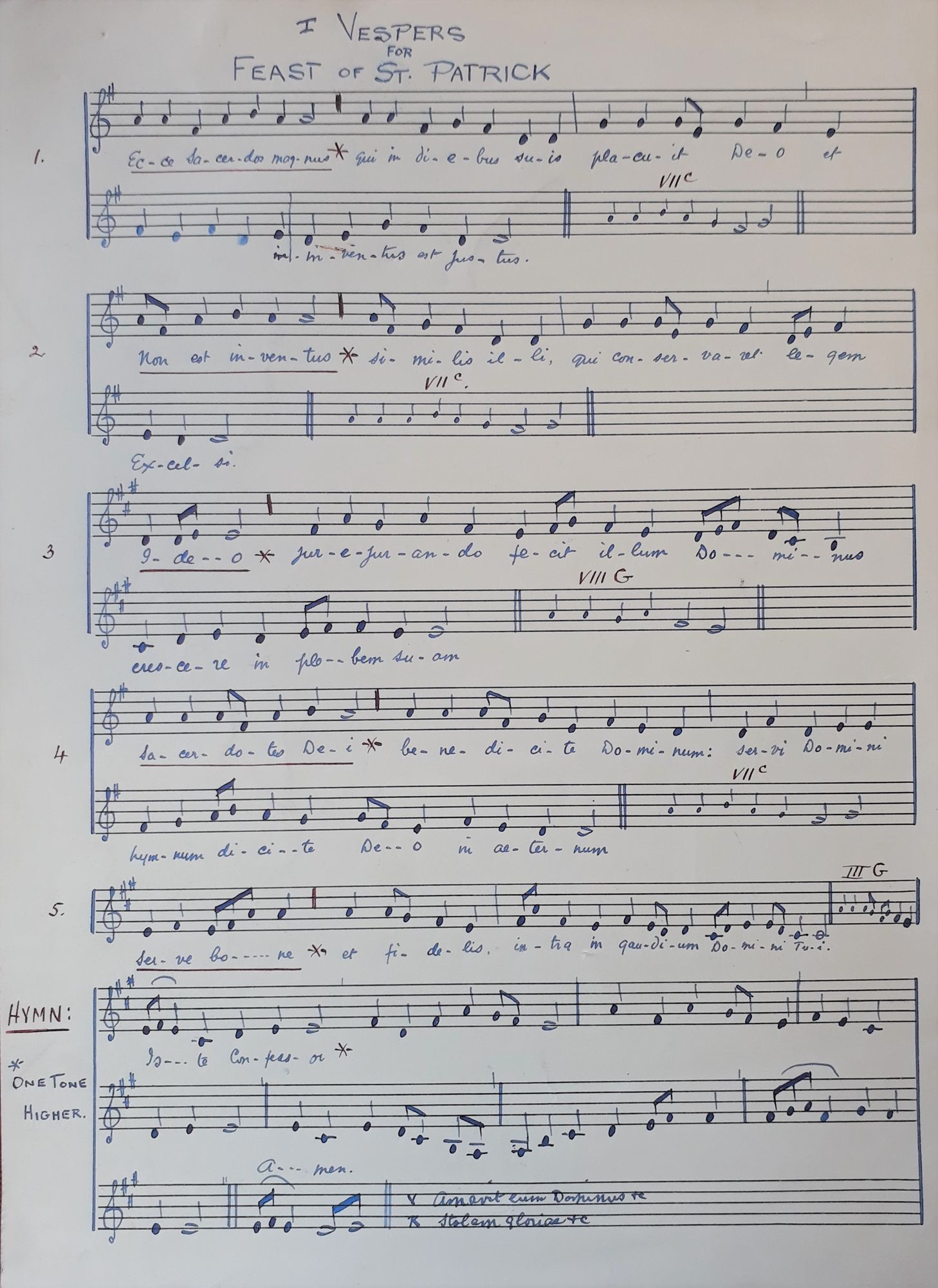 This manuscript was written by the Magister Choralis or Director of Music at the Irish College, Paris. It consists of hymns and chants used to celebrate Mass and Vespers on St Patrick’s Day and other feasts.