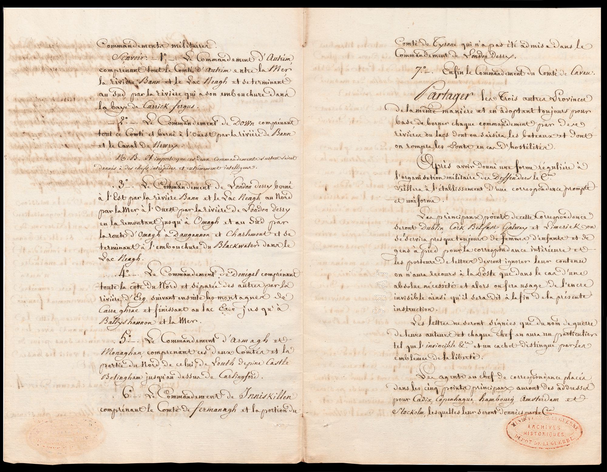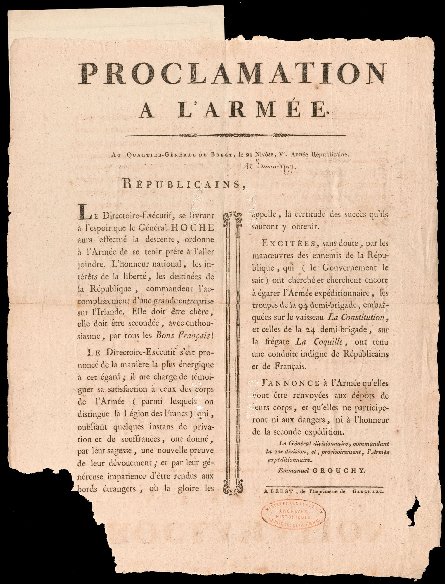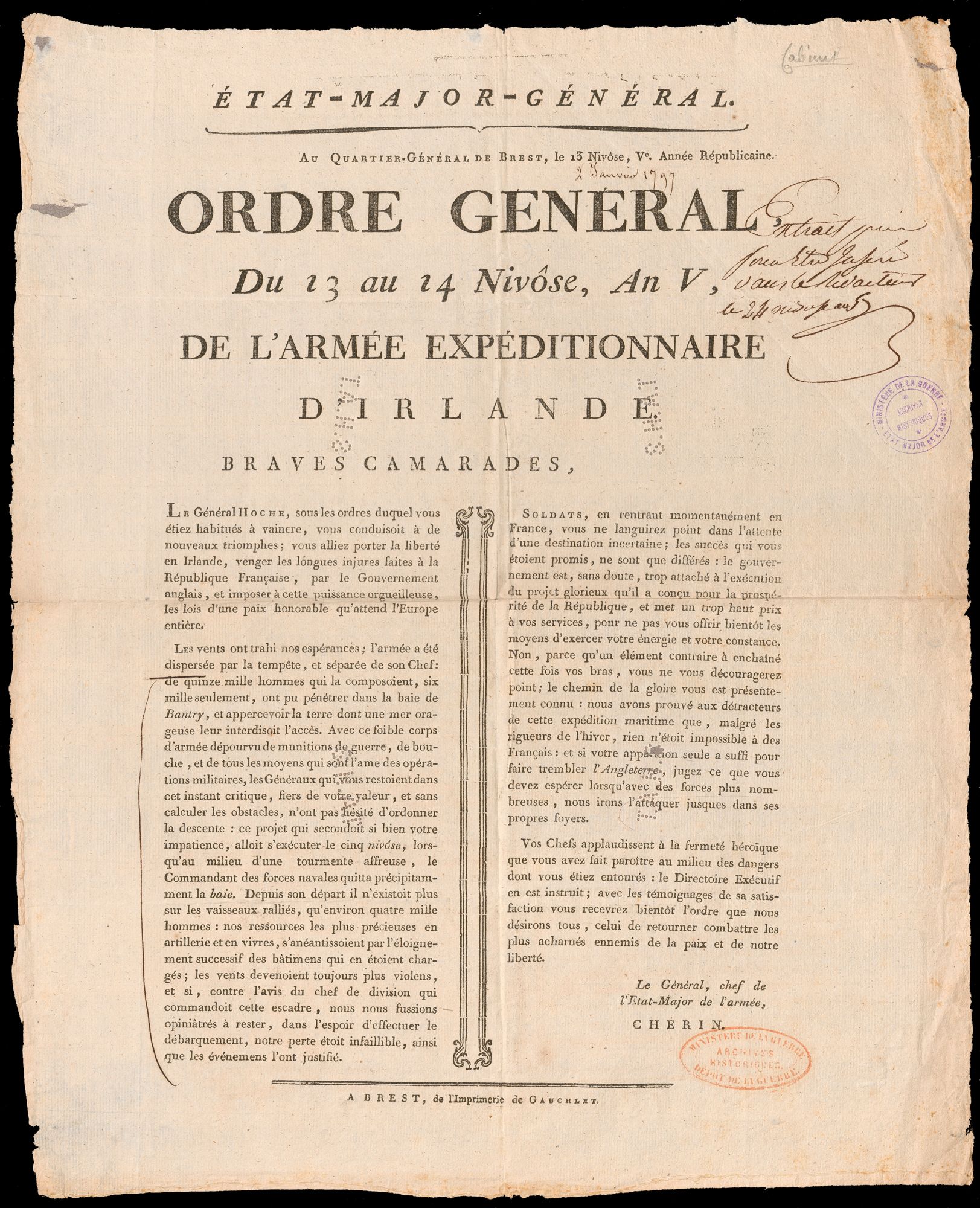 A printed notice of General Orders from Chief of the French Army’s General Staff, General Cherin dated 13 au 14 Nivôse, An V (2-3 January 1797), stating that General Hoche’s expedition to Ireland was halted by the weather and only 6000 of the 15000 troops reached sight of land at Bantry Bay. It praises the bravery and heroism of the troops and states that they will not have to wait long to return to what they desire “returning to fight the most bitter enemies of peace and our freedom”.
