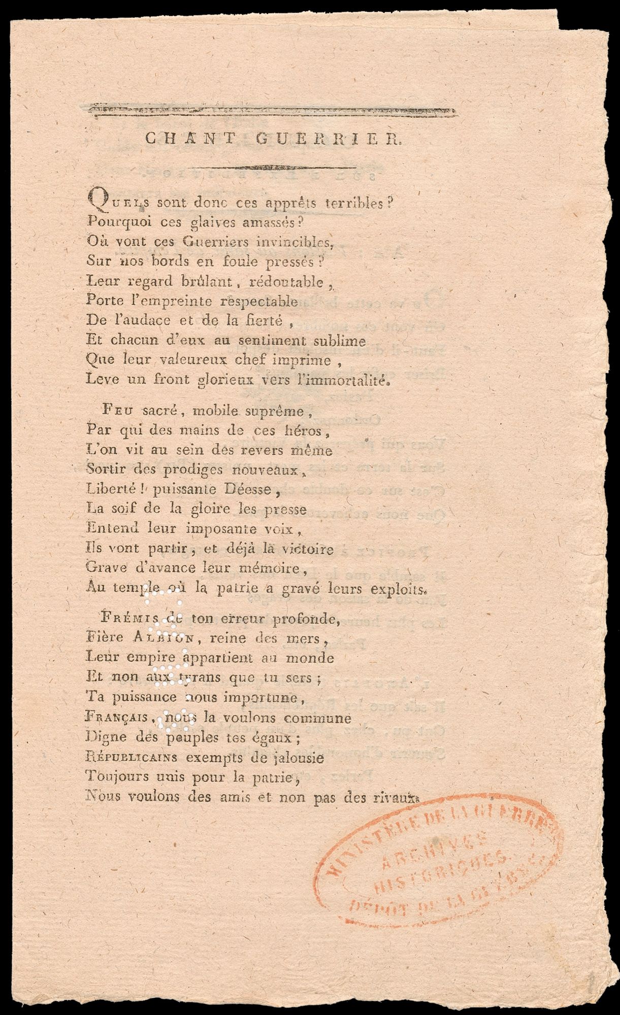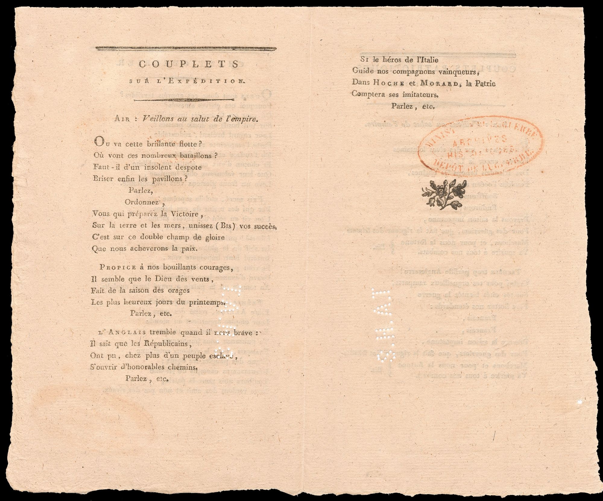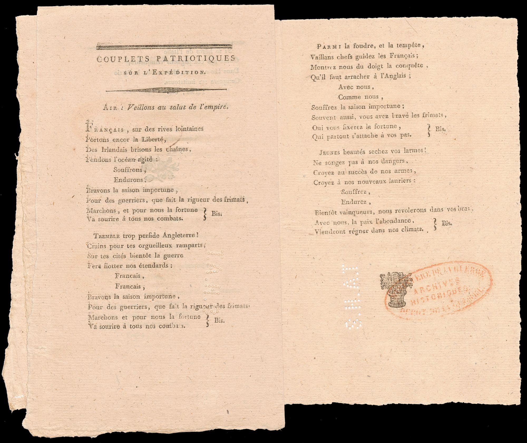 A printed notice of General Orders from Chief of the French Army’s General Staff, General Cherin dated 13 au 14 Nivôse, An V (2-3 January 1797), stating that General Hoche’s expedition to Ireland was halted by the weather and only 6000 of the 15000 troops reached sight of land at Bantry Bay. It praises the bravery and heroism of the troops and states that they will not have to wait long to return to what they desire “returning to fight the most bitter enemies of peace and our freedom”.