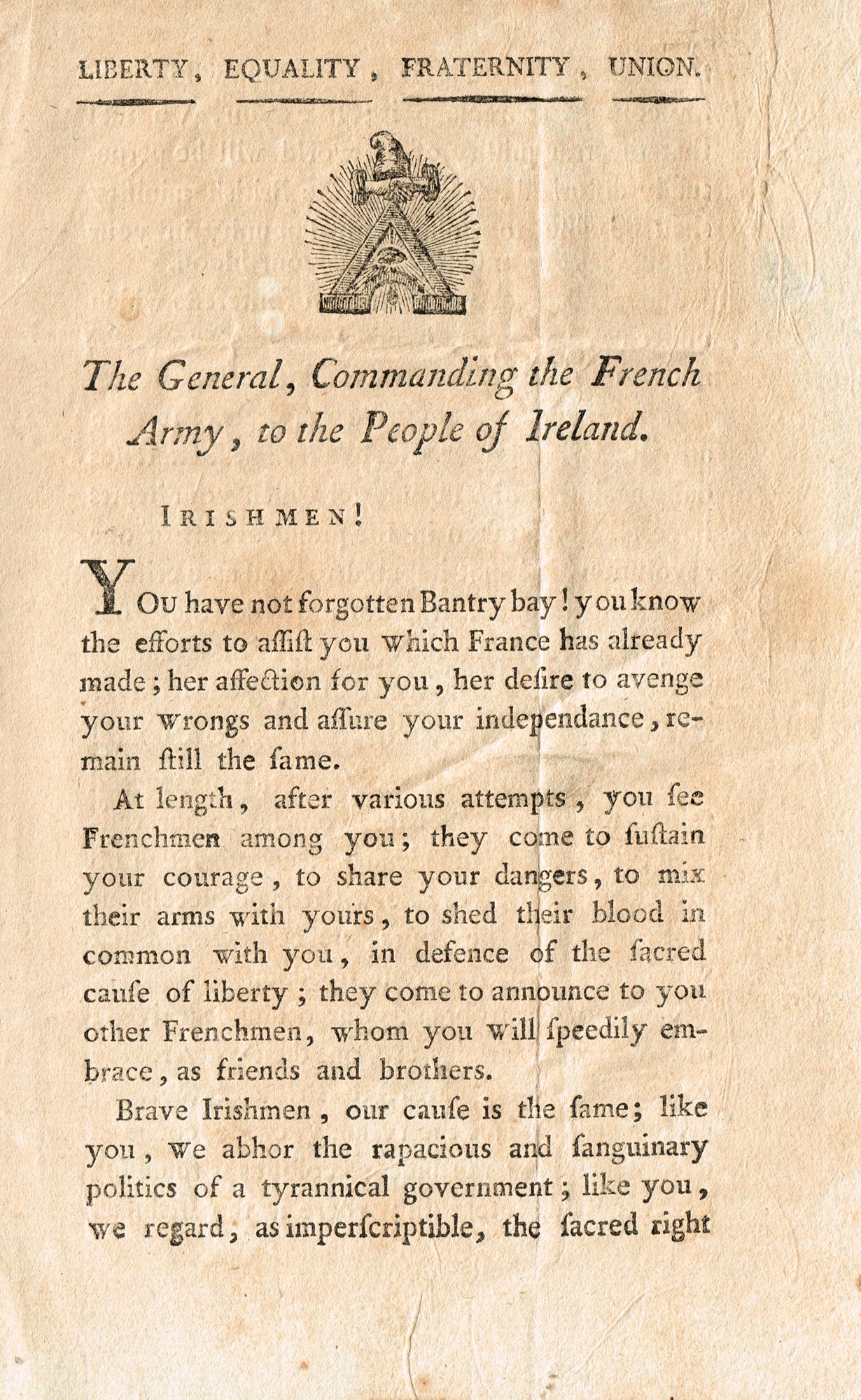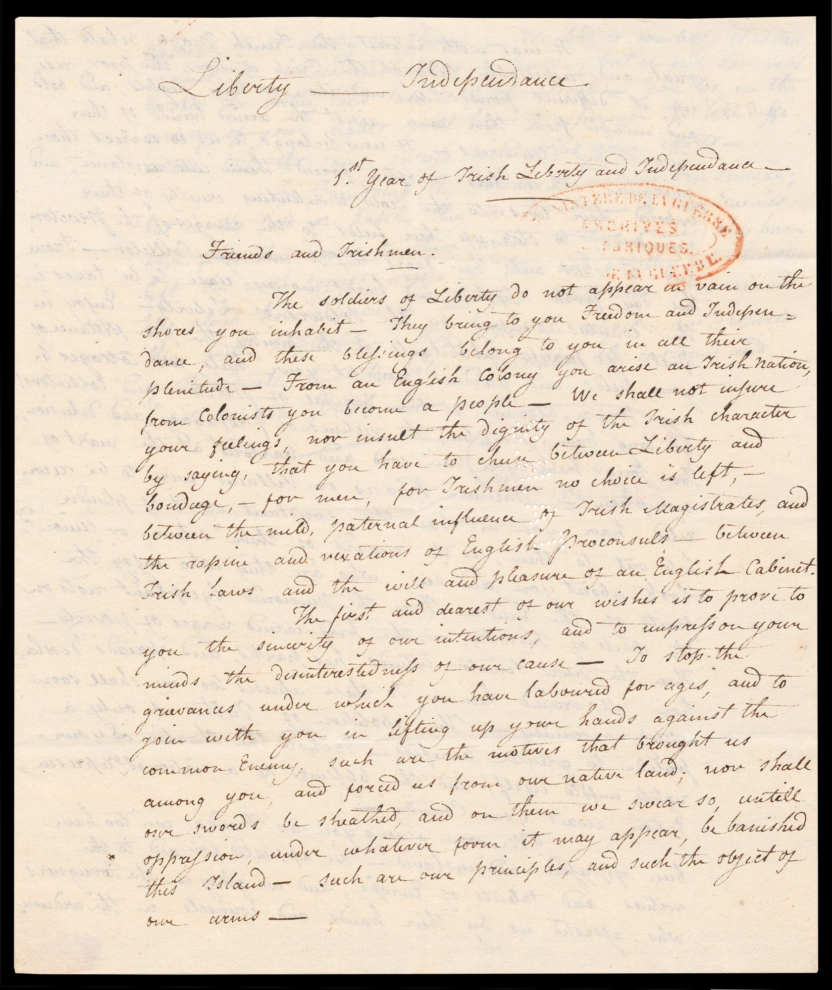 "The soldiers of Liberty do not appear in vain on the shores you inhabit- They bring you Freedom and Indepen-dance, From an English Colony you arise an Irish nation, from colonists you become a people- We shall not injure your feeling, nor insult the dignity of the Irish character by saying that you have to choose between Liberty and Bondage, [...]”