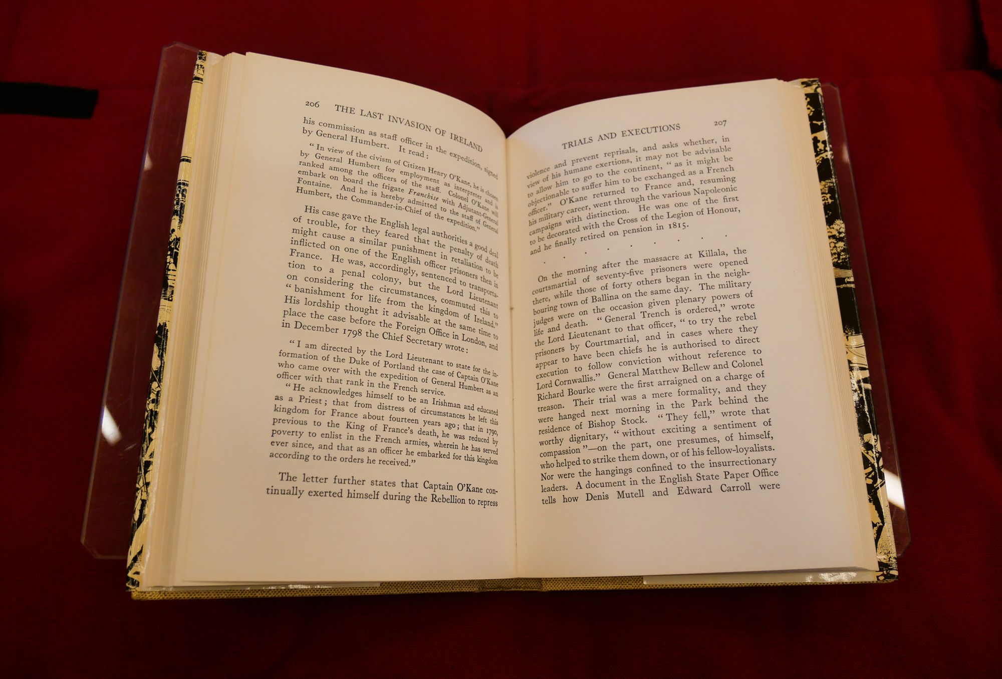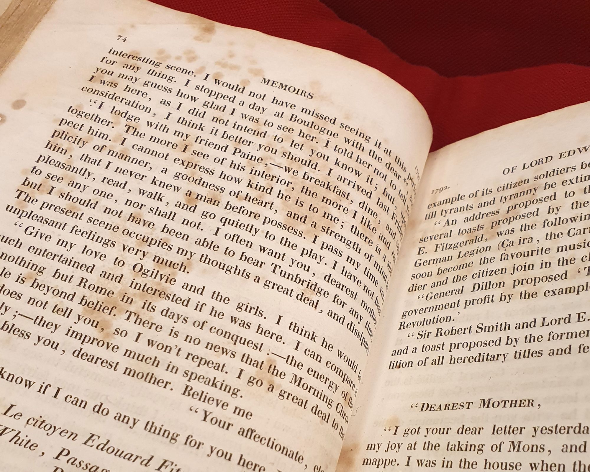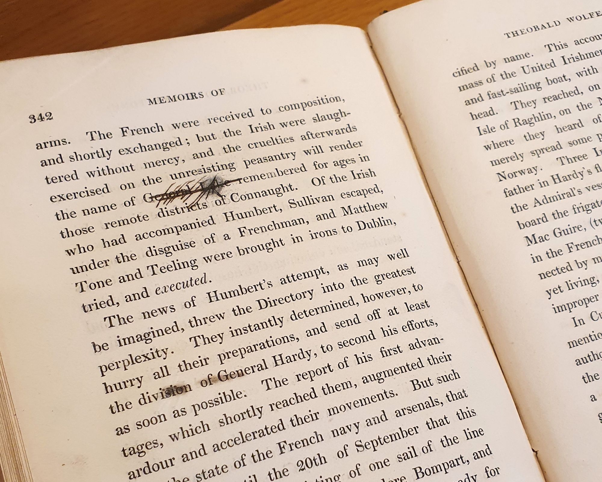 Tone’s memoirs, 2 volumes (1827): Vol. II. Open on page relating to Humbert’s expedition and the execution of Bartholomew Teeling and Tone’s brother Matthew. This part of the memoirs was written by Tone’s son William Theobald Wolfe Tone.