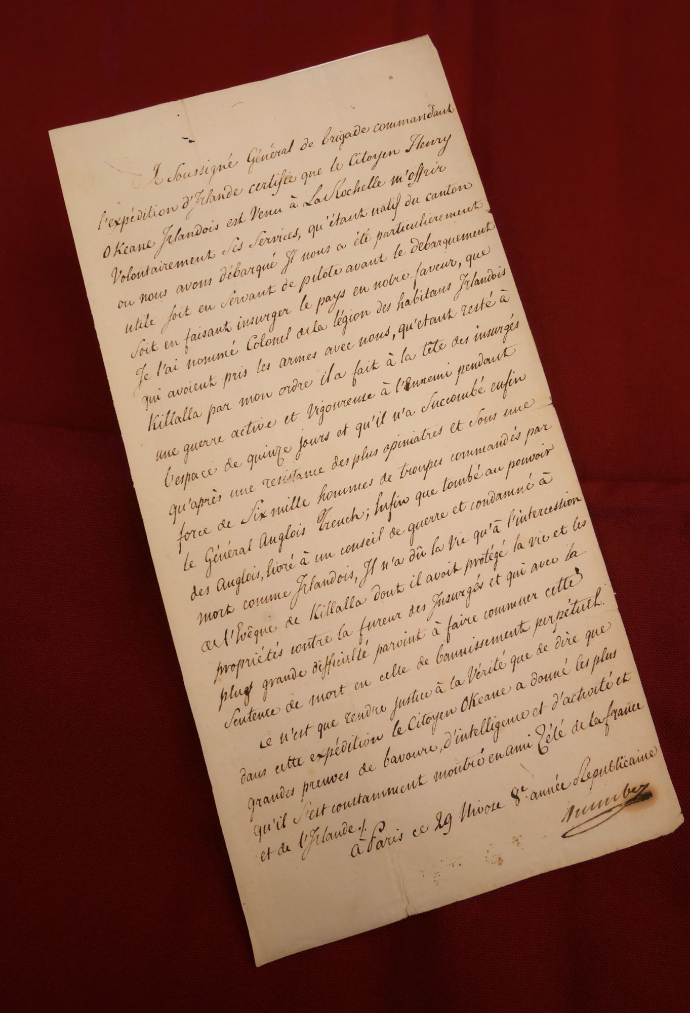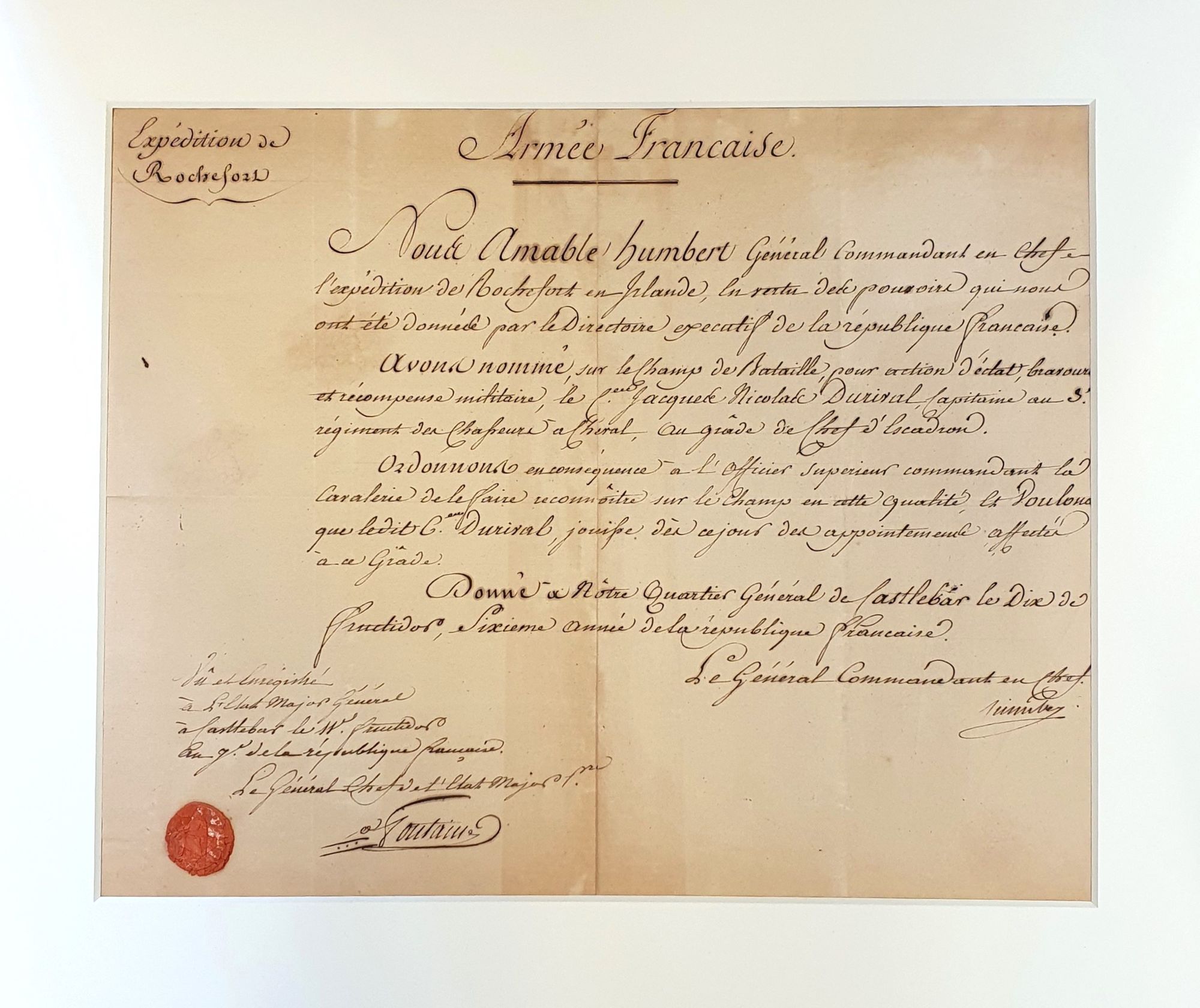 Dated the day of the Battle of Castlebar, i.e. 10 fructidor 6, in the republican calendar (27 August 1798). Signed by Adjunct General Fontaine.