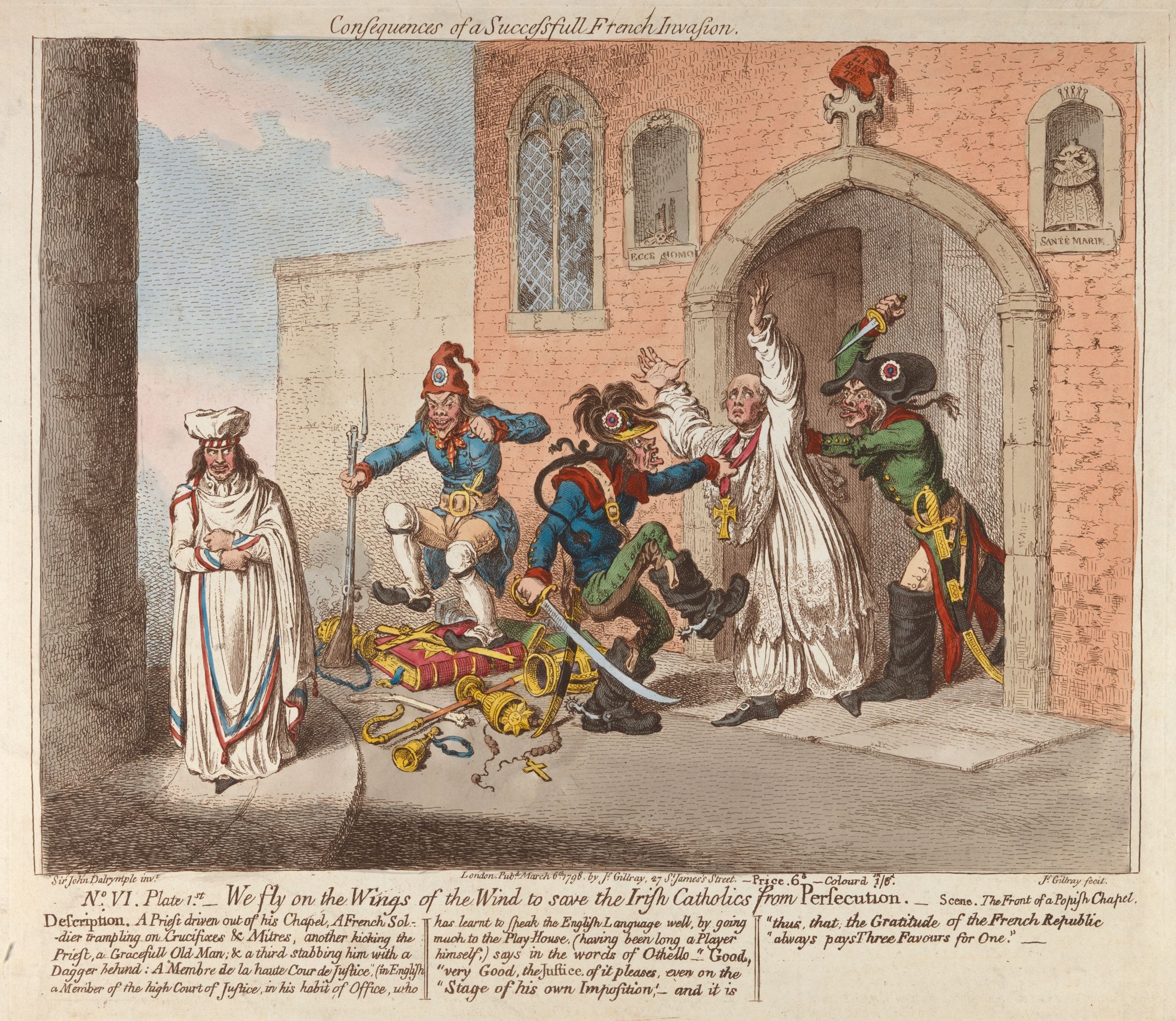 It was predicted that a successful French invasion would see churches defiled and looted and clergymen slaughtered. However, writing to his wife on 28 September, 1798, with details of the campaign in Co. Mayo, John Dawson 1st Earl of Portarlington and Colonel of Queen’s County Militia stated ‘the situation of the country and towns I have passed through is most deplorable—the corn left in the ground, and the houses of loyal men plundered and wrecked, and what the rebels have spared the army has destroyed.[...] we have the utmost difficulty in curbing their licentiousness.’