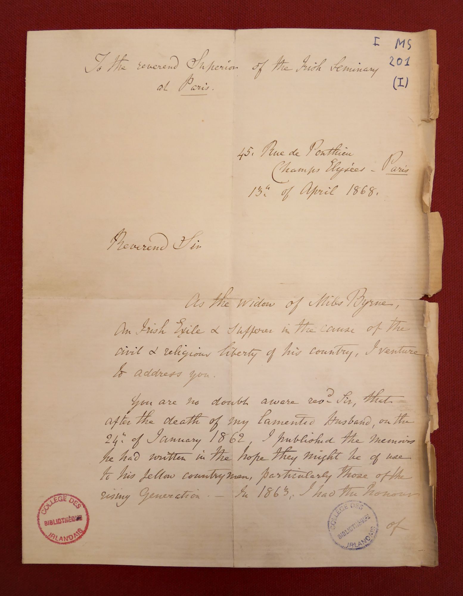 Donated to the Irish College by his widow Fanny Byrne in 1868. Her signed letter is kept with the volumes. Manuscript written by Fanny Byrne and reviewed by Miles Byrne.
