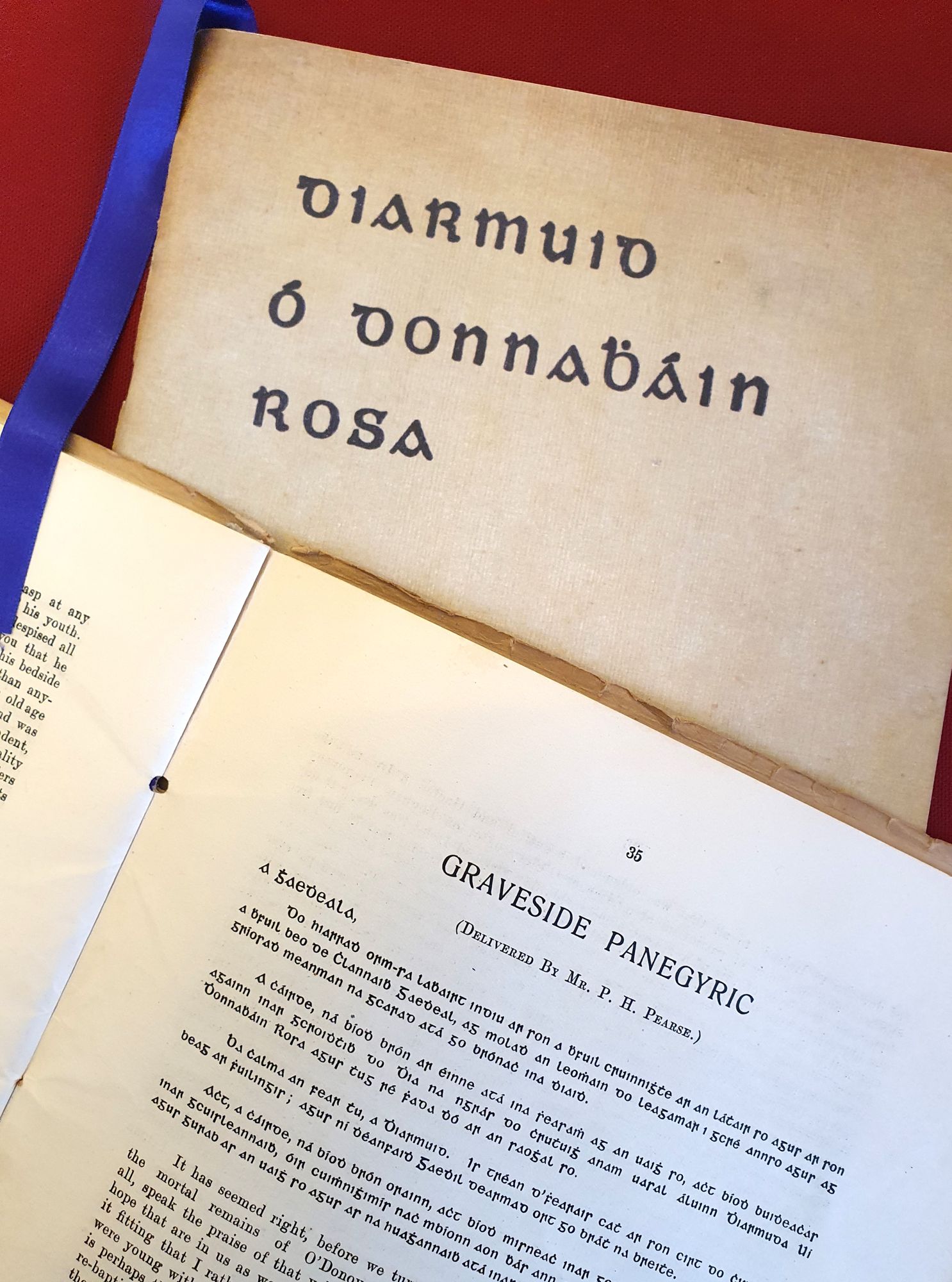 Souvenir publication for the funeral of the Fenian O’Donovan Rossa at Glasnevin Cemetery, Dublin, 1st Aug. 1915. 2nd edition, open on the text of Pearse’s graveside oration which references Tone and ended with the line “[…] the fools, the fools, the fools! They have left us our Fenian dead and while Ireland holds these graves, Ireland unfree shall never be at peace” and other contributions by Thomas Mac Donagh, Seamus O’Sullivan, and James Connolly’s statement on The Citizen Army.