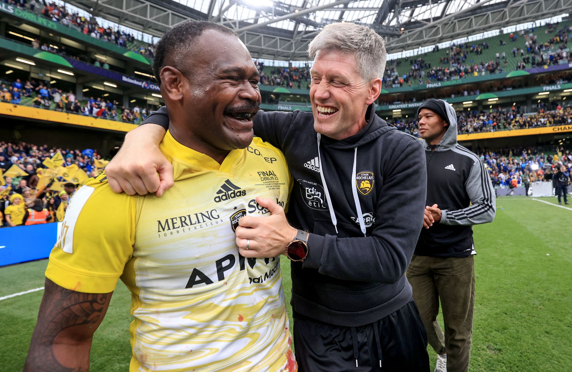 Irish international Ultan Dillane celebrates with the Champions Cup trophy he won playing with La Rochelle in 2023.