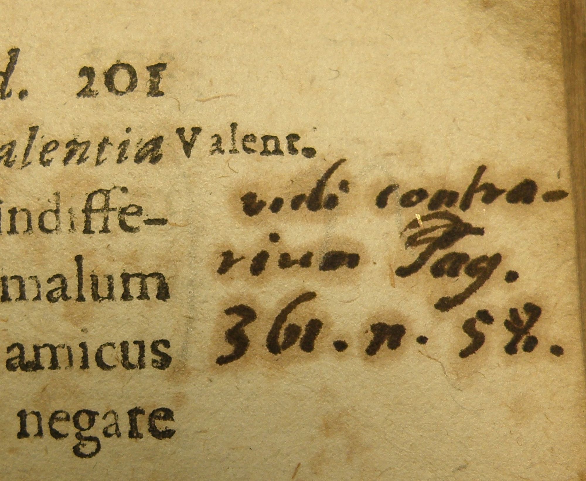 In the same book, other readers highlight the Jesuit's contradictions with references in the margins imitating the printed marginalia. When the author replied “yes” at one point and “no” later on to the question "Is it a sin to rent one's house to an adulterous couple?", readers pointed out the dissonance in the margin. The note: "vedi contrarium Pag. 361 no. 58" (See opposite on p. 361, no. 58) has a similar note on page 361.