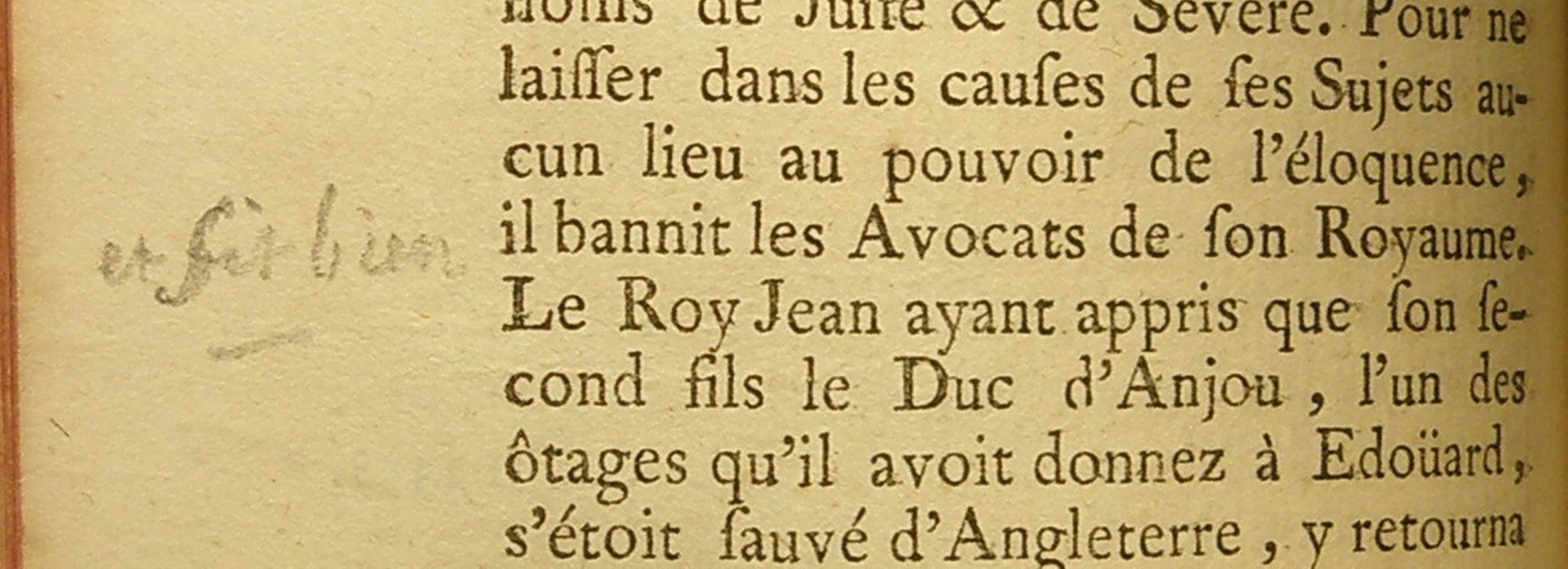 "And well done", notes the reader of Bossuet's Suite de l’histoire universelleopposite the passage about Don Pedro of Portugal's life, who banned lawyers from his kingdom. It is the only annotation written in the book.