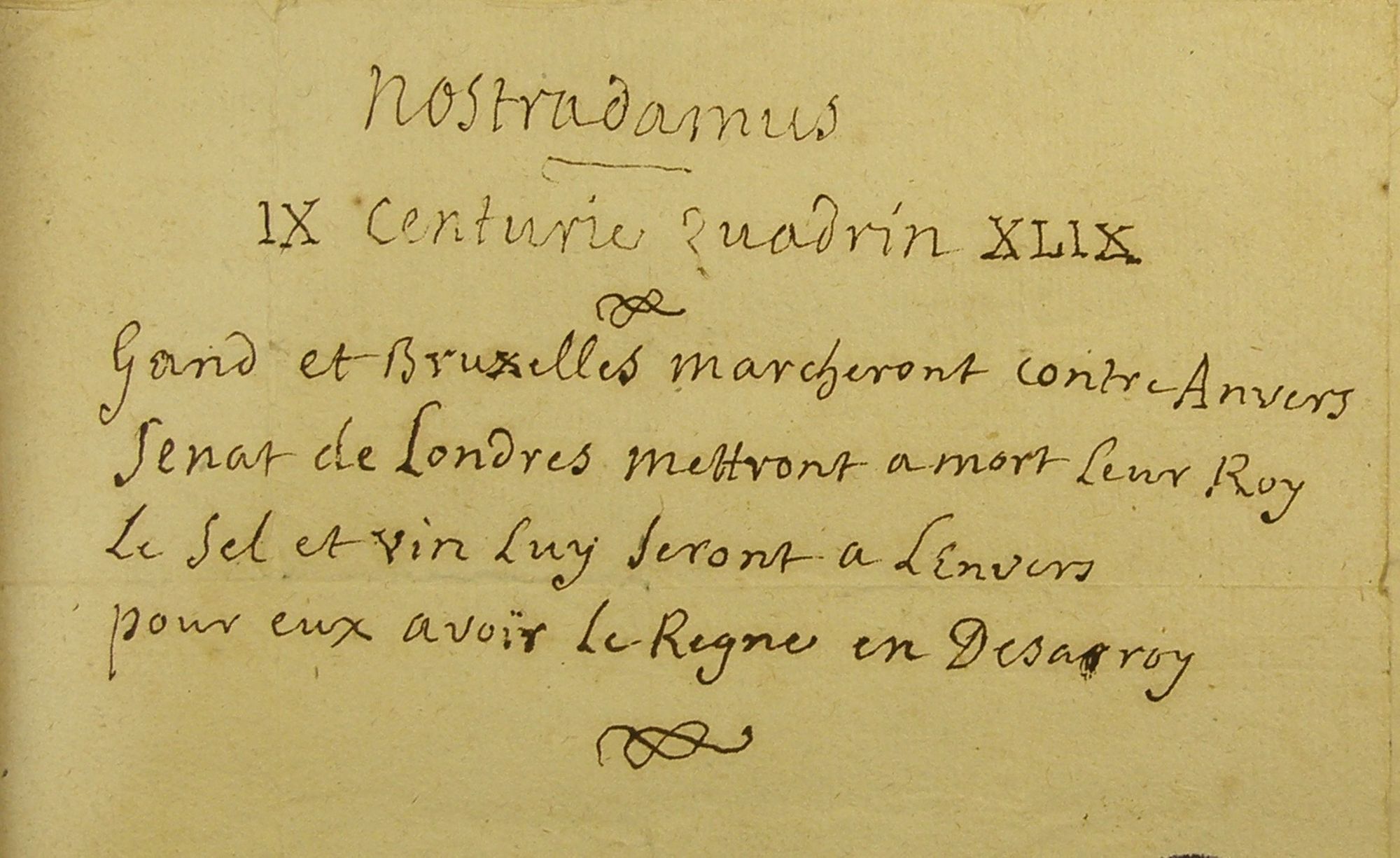 This prophecy of Nostradamus (1503-1566) is said to have predicted the execution of Charles I of England (1649). Why was it written at the beginning of a volume of Conclusions de la faculté de Paris (1717), which examines the loyalty of subjects to their king, the security of monarchs and peace across the State? In any case, the juxtaposition of these two theses casts serious doubt on the integrity of the regime’s promises.