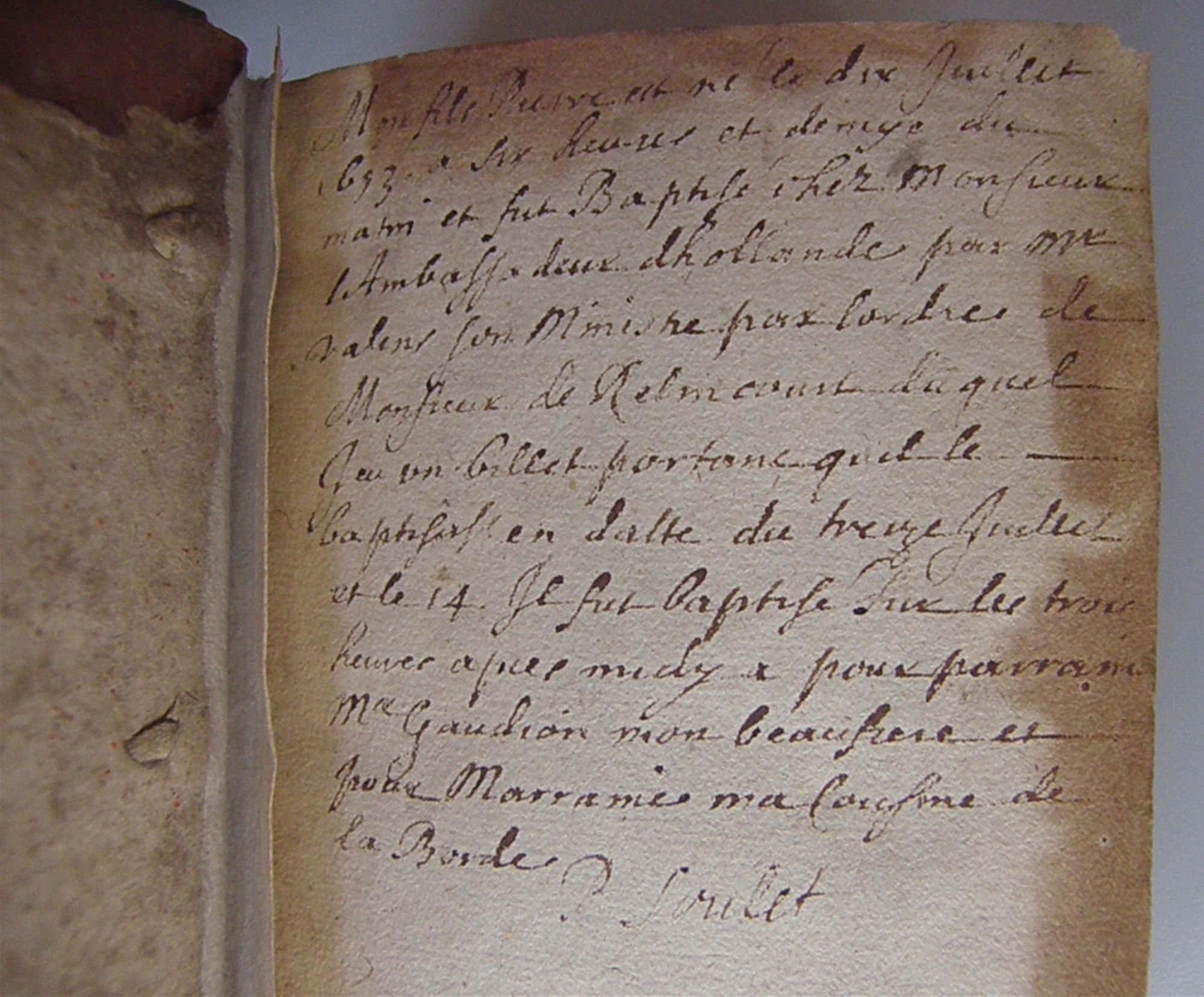 « My son Pierre was born on 10 July 1693 at half past six in the morning and was baptised at the home of Mr. The Ambassador of Holland, by his minister, Mr. Valens, on the orders of Mr. de Relmcourt, from whom I have a certificate showing that he baptised him on 13 July, and on 14 July, at three in the afternoon, he was baptised with his godfather Mr Gaudion, my brother-in-law and his godmother, my cousin, from La Borde