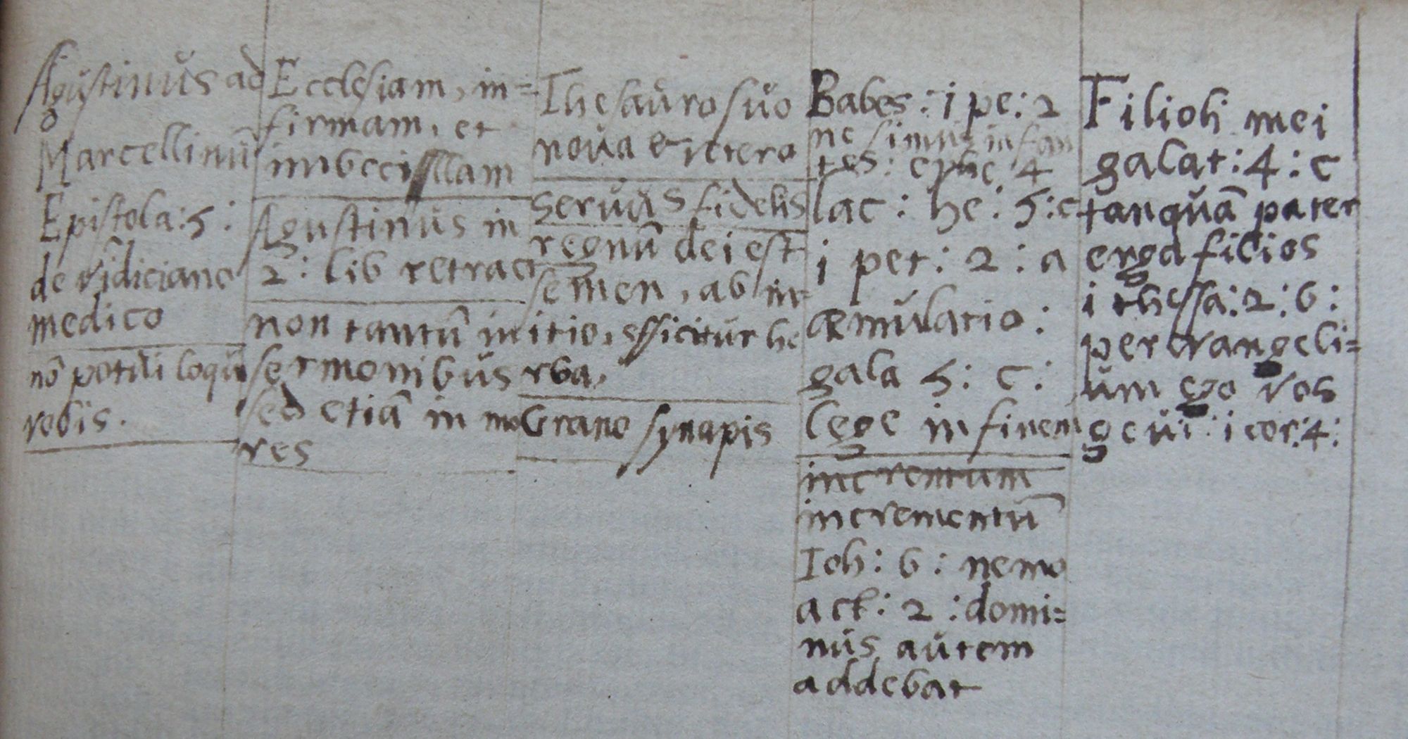 On a page inserted in a New Testament from 1538, the reader laid out five columns of various biblical citations about children, milk, seeds and choices. This table illustrates the scholarly practice of creating collections of "common places". It also demonstrates an essential principle of biblical study, the self-explanation of Holy Scripture. Through cross-referencing, each text made the other easier to understand.