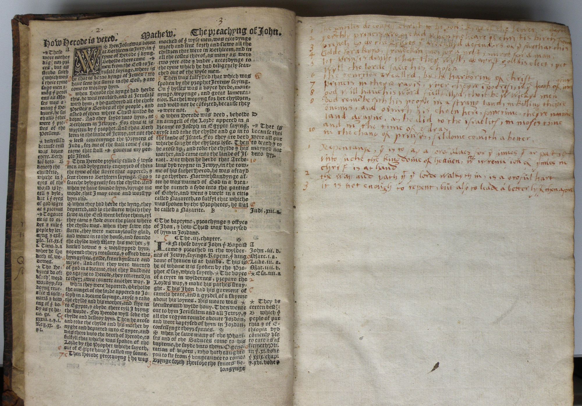 Some notes are merely paraphrased (1, 2), while others shed light on biblical symbolism (4). There are religious (5) and political (6) thoughts, as well as references to contemporary events (3). In the same Bible from 1538, the reader added chapter numbers above the columns to make the book easier to navigate. He or she highlighted forms of speech in the Gospel of Matthew by using a symbol system for which the "user instructions" were added at the beginning of the book. Semi-circular markings (C) refer to words spoken by the evangelist while circular markings (O) refer to indirect speech. The first words of dialogue are underlined, visually highlighting the changes in forms of speech. Numbers written in the margins refer back to the comments made about the text.