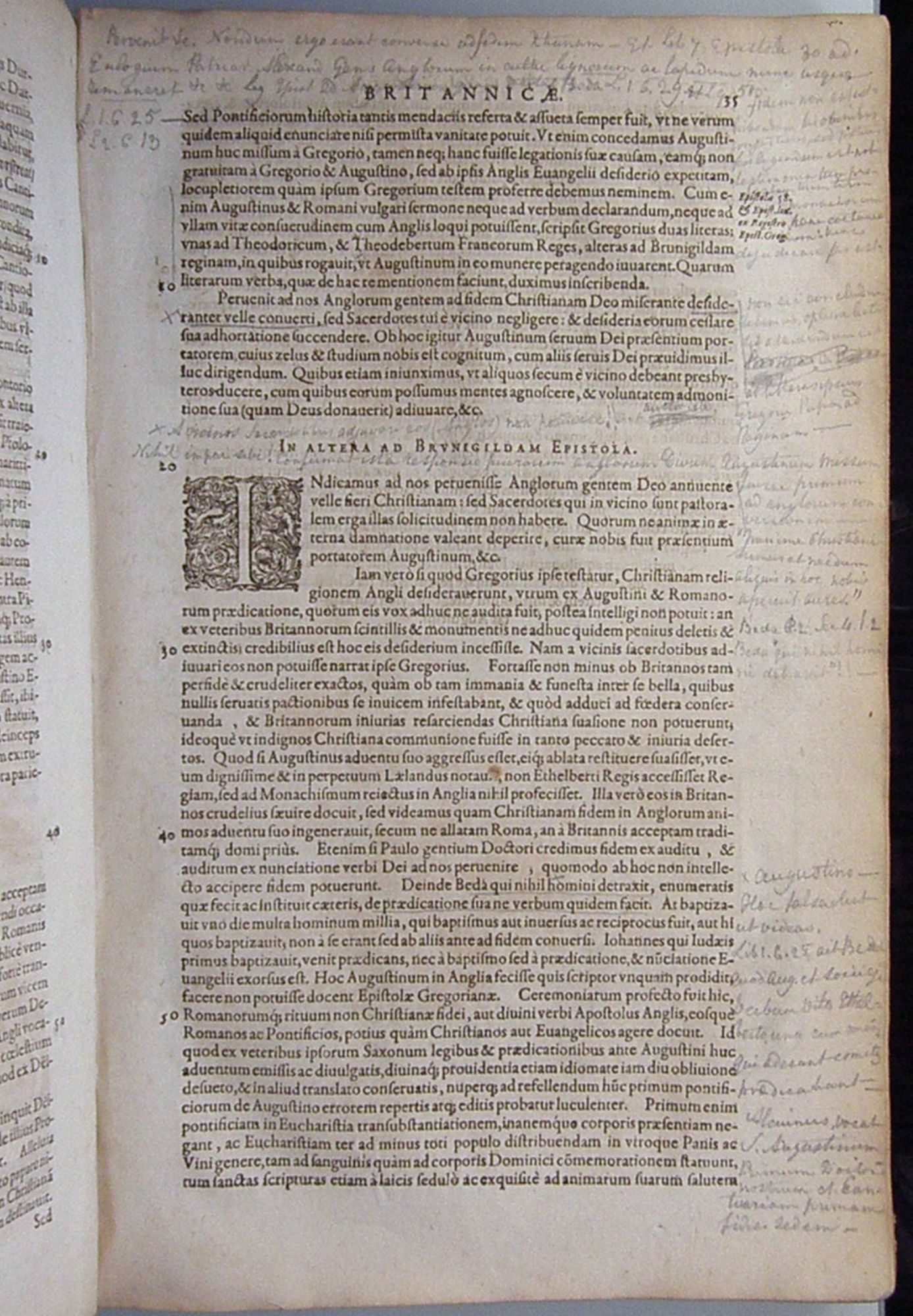 In the second half of the 16th century, religious reform under Elizabeth I and the rupture with Rome was based on a rewriting of history. The author of this history of the British Church minimises the importance of St. Augustine, sent from Rome, and his evangelist mission, writing instead of an "indigenous" conversion. The reader is offended by this characterisation. The energetic punctuation and precise citations demonstrate the intensity of this historiographic debate, which occurred almost two centuries after the book was written.