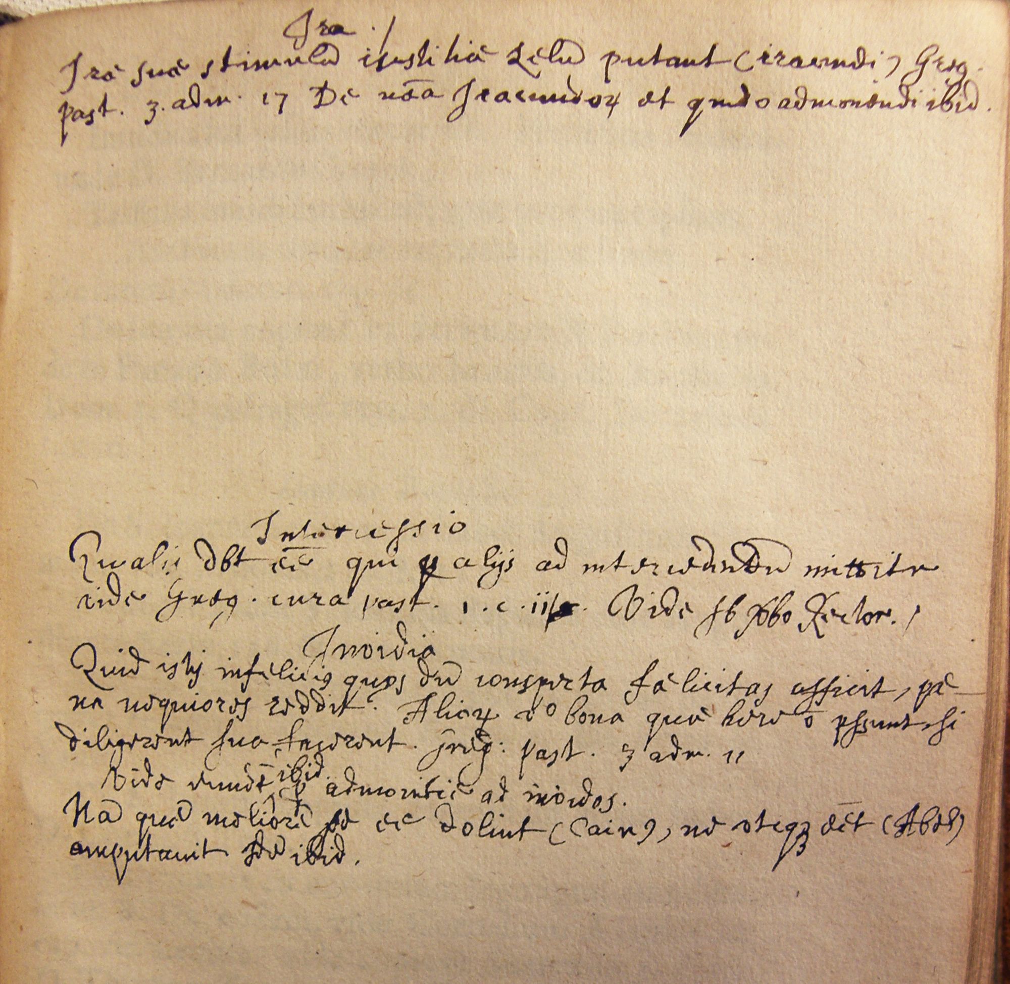 In the Thesaurus locorum communium, a repertoire written for preachers, the reader has supplemented the text with thirty-seven new sections such as those shown here: ira (anger), intercessio, indivia (desire). Their annotations shed light on the contents of the reader’s work library, consisting of the Bible, works by the Early Church Fathers and writings from classical authors. The most used work, appearing a remarkable 146 times, is De pastorali cur by St. Gregory, which was conscientiously read and commented on throughout the sections.