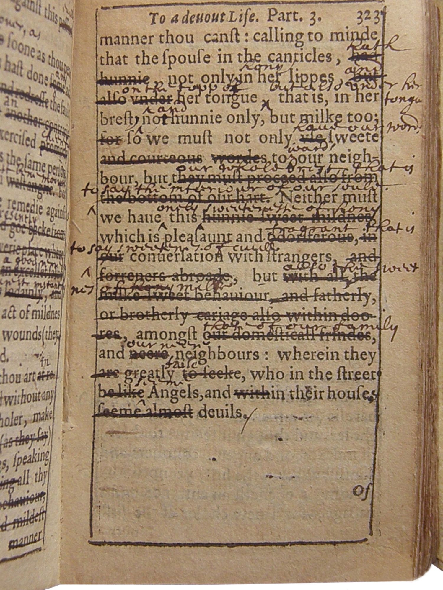 Some annotated copies were specifically used to produce a new book, like the classic editions of humanist philosophers and volumes corrected by their authors in preparation of an updated edition. This copy of the Introduction to the Devout Life by François de Sales was used as a working tool for the new translation published in Paris in 1648 by the "English priests of the college of Tournai". The book illustrates how English Catholics exiled to France played a role in the diffusion of numerous devotional texts. In this way, François de Sales' work had a significant impact on English religious literature in the first half of the 17th century. His influence extended far beyond the confines of Catholic communities.