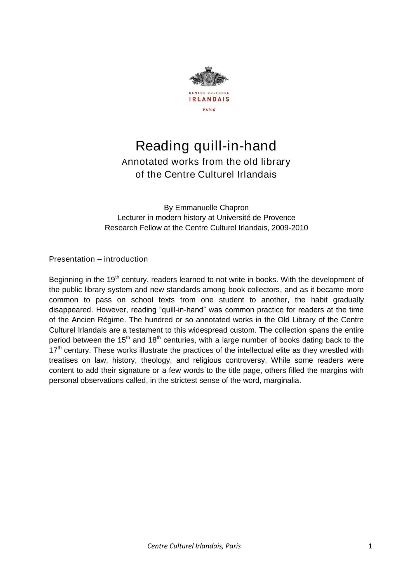 Beginning in the 19th century, readers learned to not write in books. With the development of the public library system and new standards among book collectors, and as it became more common to pass on school texts from one student to another, the habit gradually disappeared. However, reading “quill-in-hand” was common practice for readers at the time of the Ancien Régime. The hundred or so annotated works in the Old Library of the Centre Culturel Irlandais are a testament to this widespread custom. The collection spans the entire period between the 15th and 18th centuries, with a large number of books dating back to the 17th century. These works illustrate the practices of the intellectual elite as they wrestled with treatises on law, history, theology, and religious controversy. While some readers were content to add their signature or a few words to the title page, others filled the margins with personal observations called, in the strictest sense of the word, marginalia.