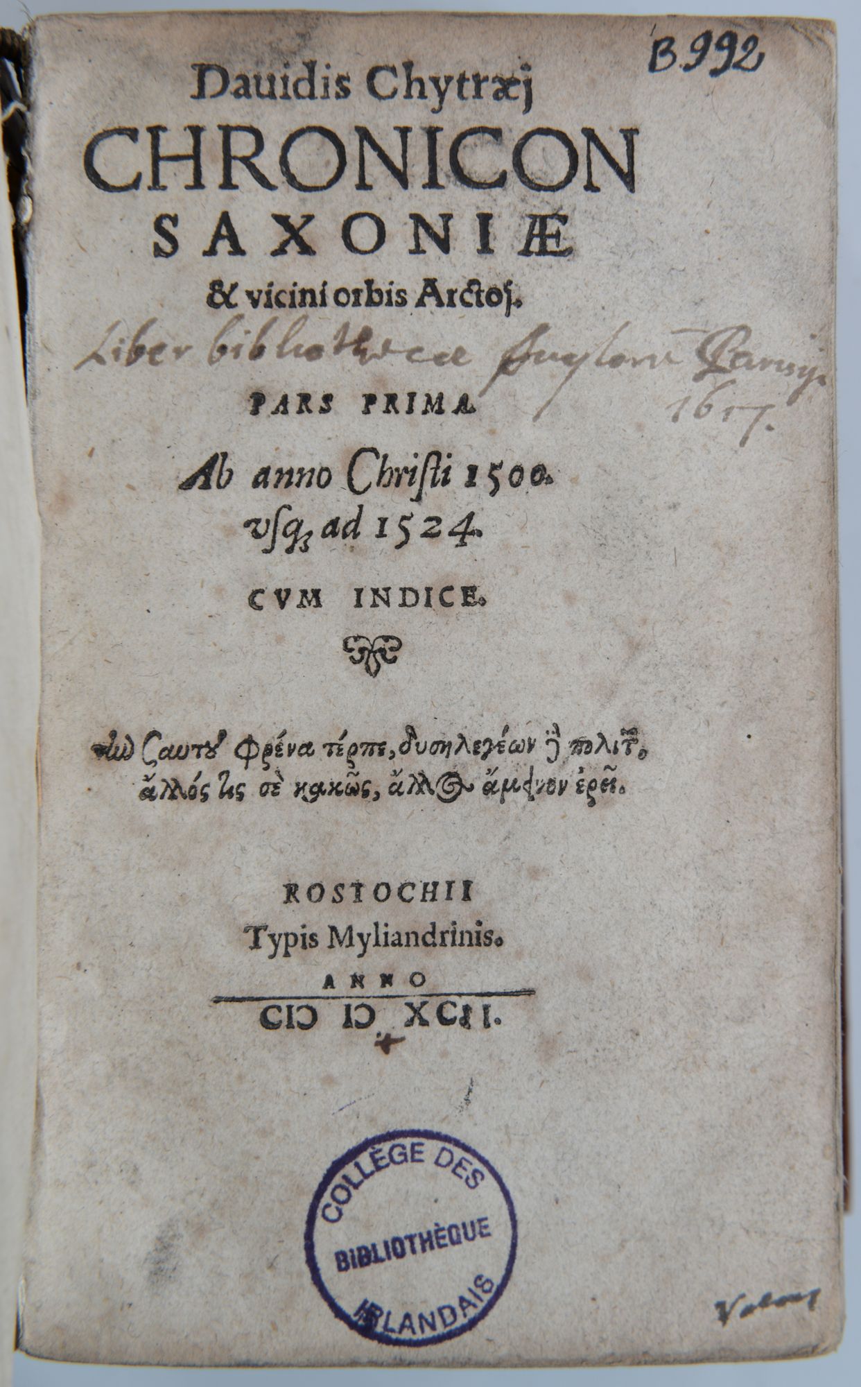 D. Chyträus, Chronicon Saxoniae, Rostock: Stephan Möllemann for Lorenz Albrecht in Lübeck, 1590, USTC 628487 – B 992.