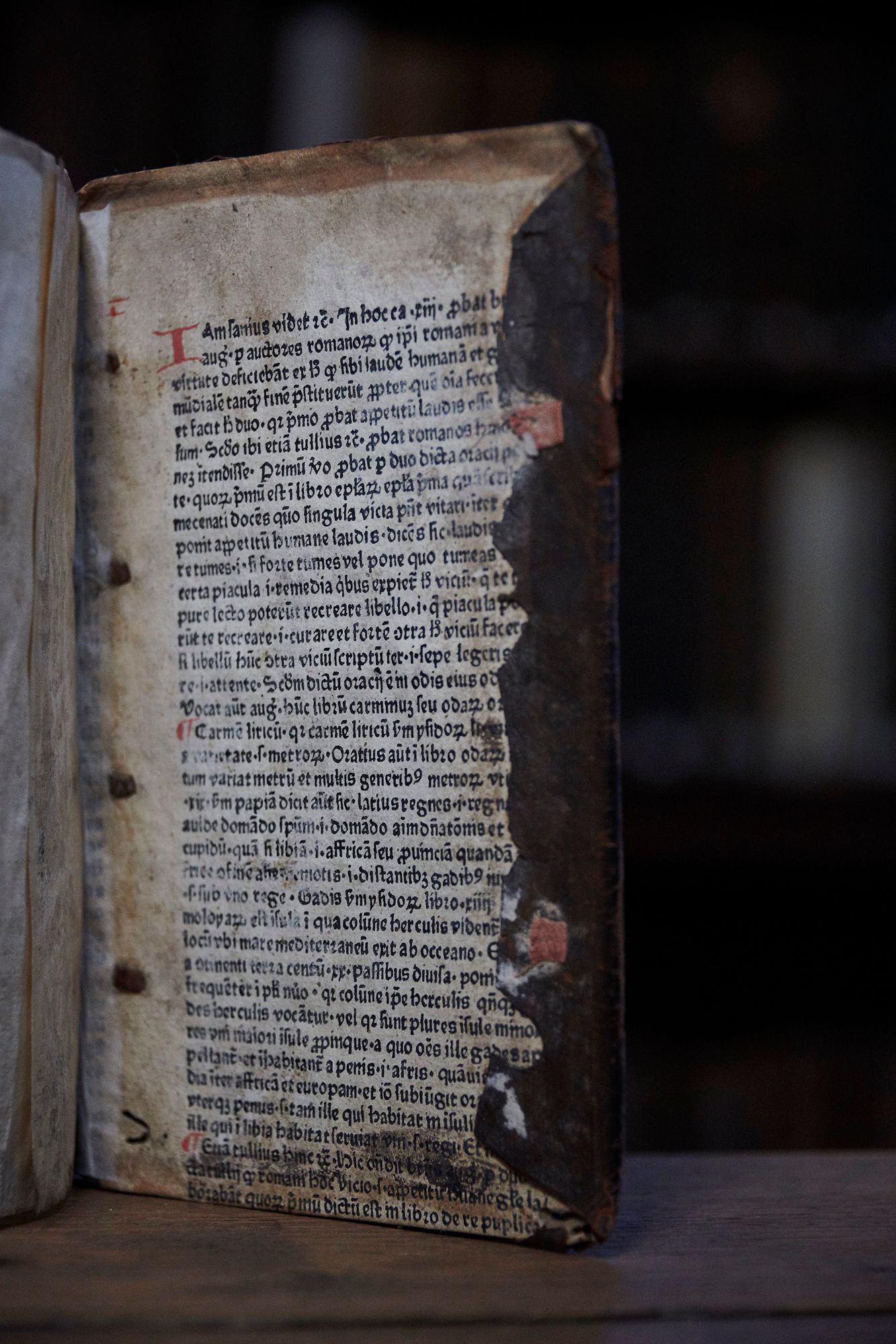 Fragments of the library’s oldest edition, an incunabulum, are hidden within the binding of this book. Printed in Basel in 1479, this edition of Saint Augustin’s City of God had lost its value by the mid-sixteenth century. The page shown here illustrates the contemporary practice of illuminating the page with handdrawn ornate initials – a practice that was sometimes problematic as exemplified here where the illuminator has erroneously inserted a N rather than an I.