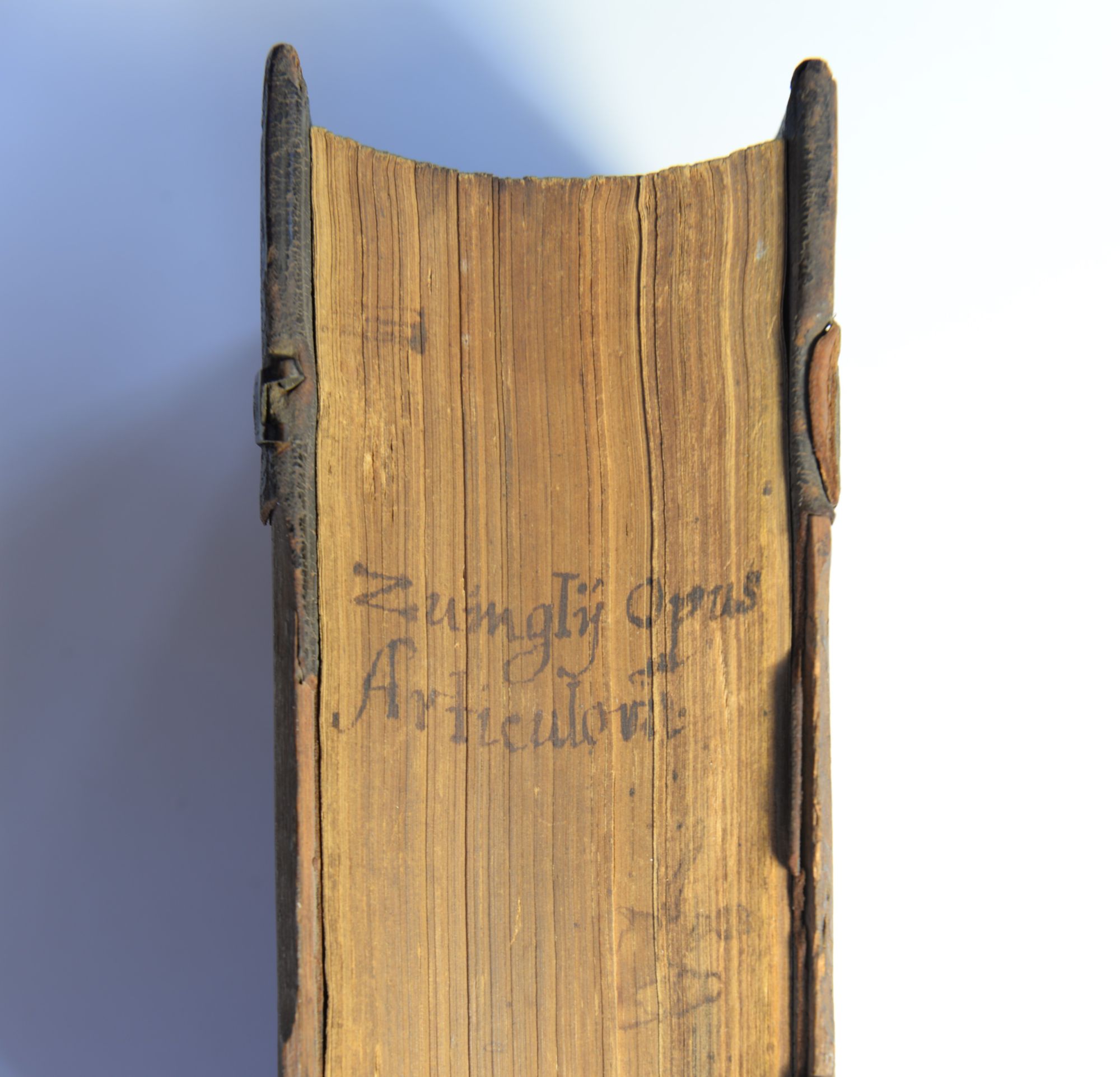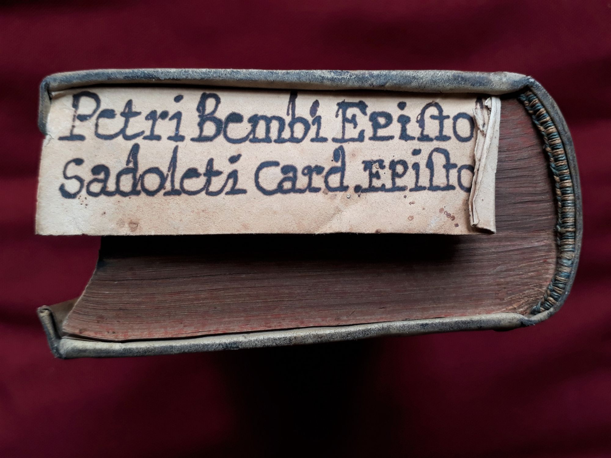 During the Renaissance, it was common practice to inscribe the author’s name and the title on the edge in order to facilitate its identification on the shelves as, in this period, books were commonly arranged with their edges out.