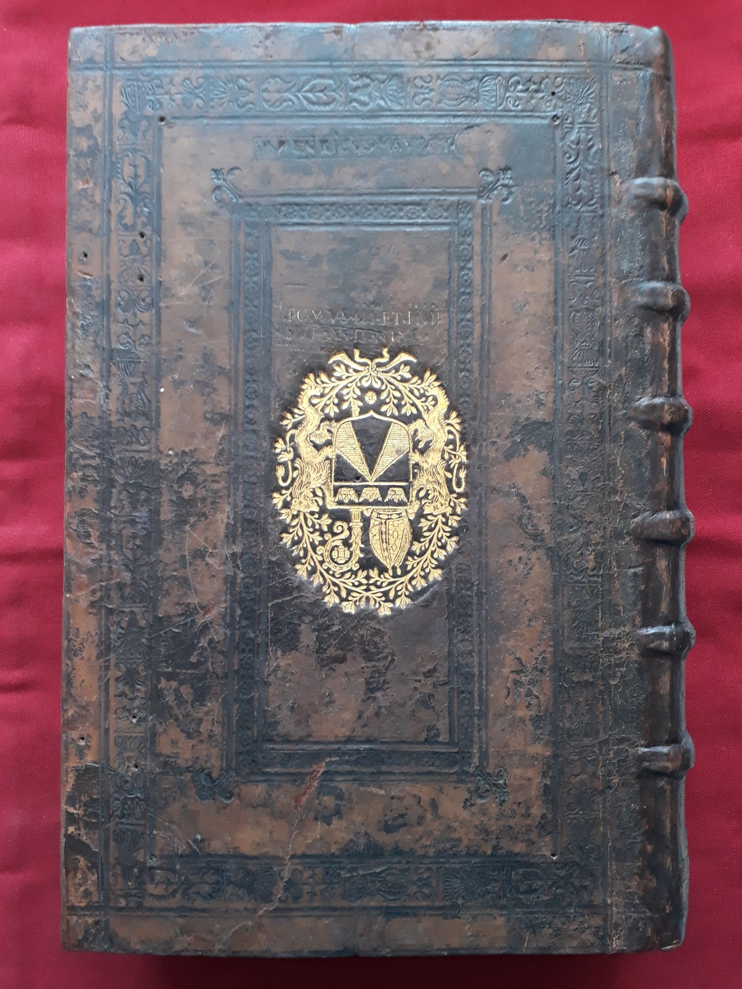 - Stamped coat of arms: A process that decorates the binding with the owner’s coat of arms. The binder heated an engraved design, added gold leaf then stamped the design on the leather that covers the boards.