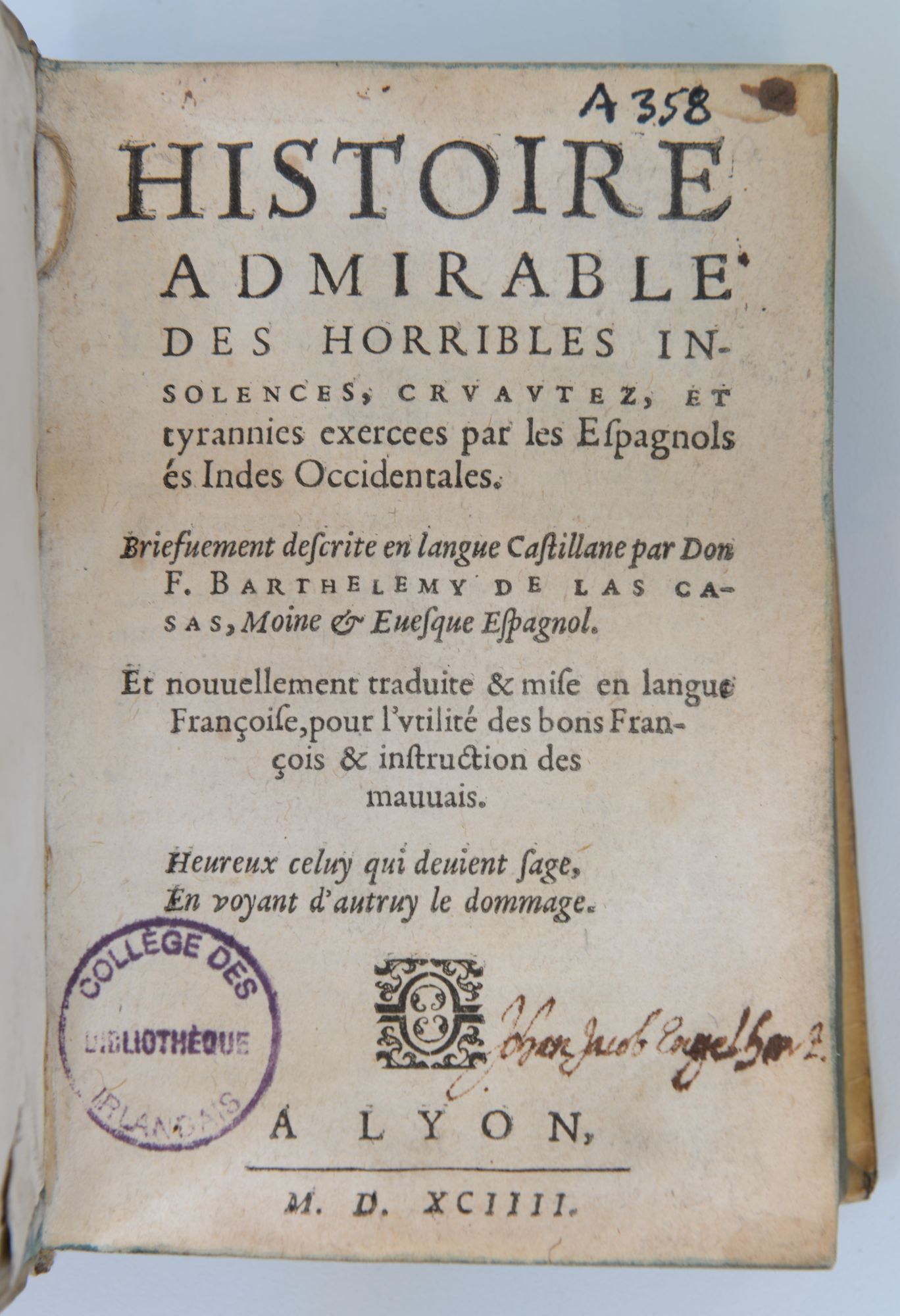 Bartolomé de las Casas, Histoire admirable des horribles insolences, cruautez, et tyrannies exercees par les Espagnols és Indes Occidentales, Lyon: s.n., 1594, USTC 37555 – A 358.