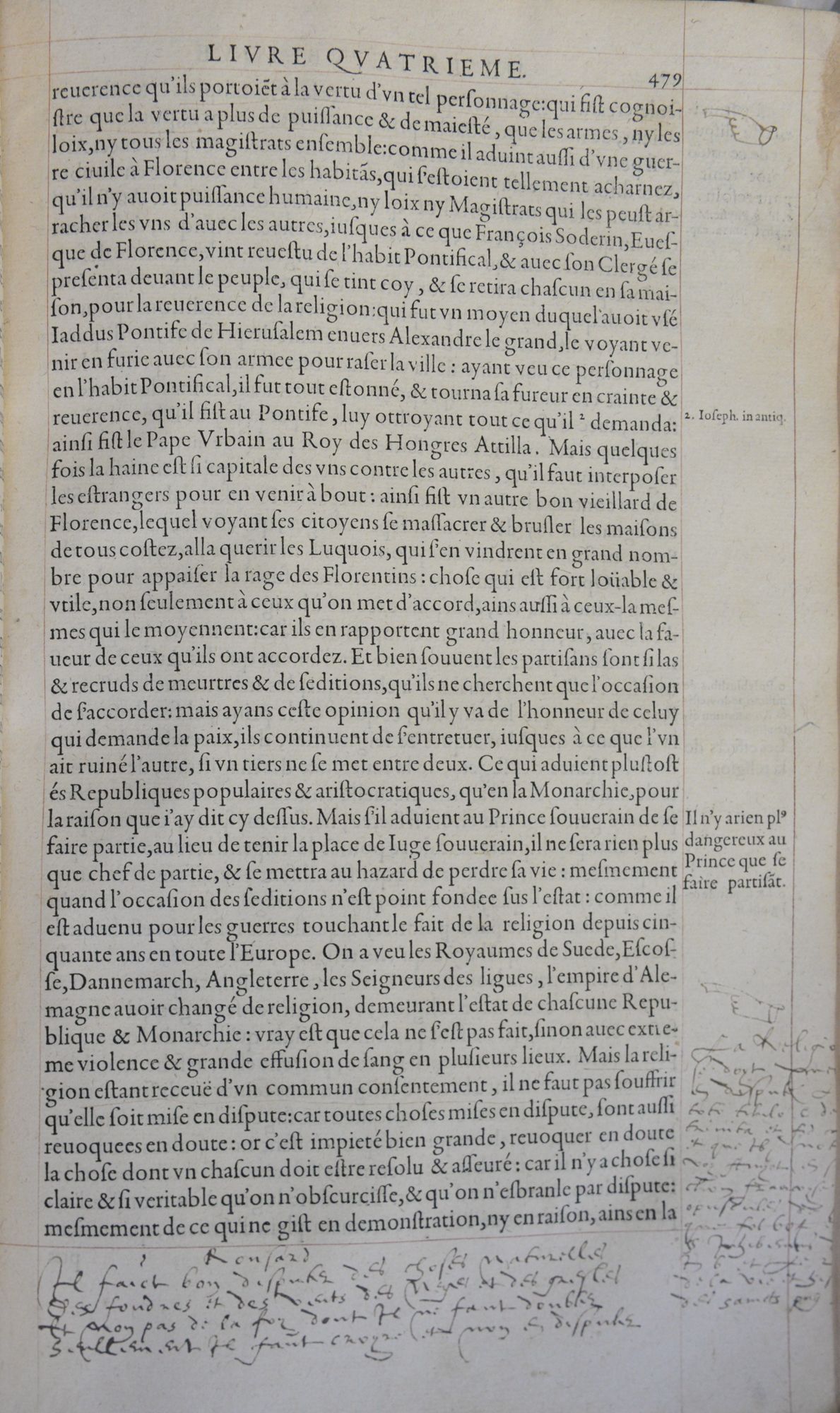 Annotations are often useful clues to understanding how books were read and sometimes even tell us of the context in which they were understood. Here, we see a surprising mixture of Bodin’s political theory and the poetry of Ronsard. The verse copied at the bottom of the page reads: “Il faict bon disputer des choses naturelles / Des foudres et des vents, des neges et des gresles / Et non pas de la foy dont il ne faut doubter / Seullement il faut croyre et non en disputer”.