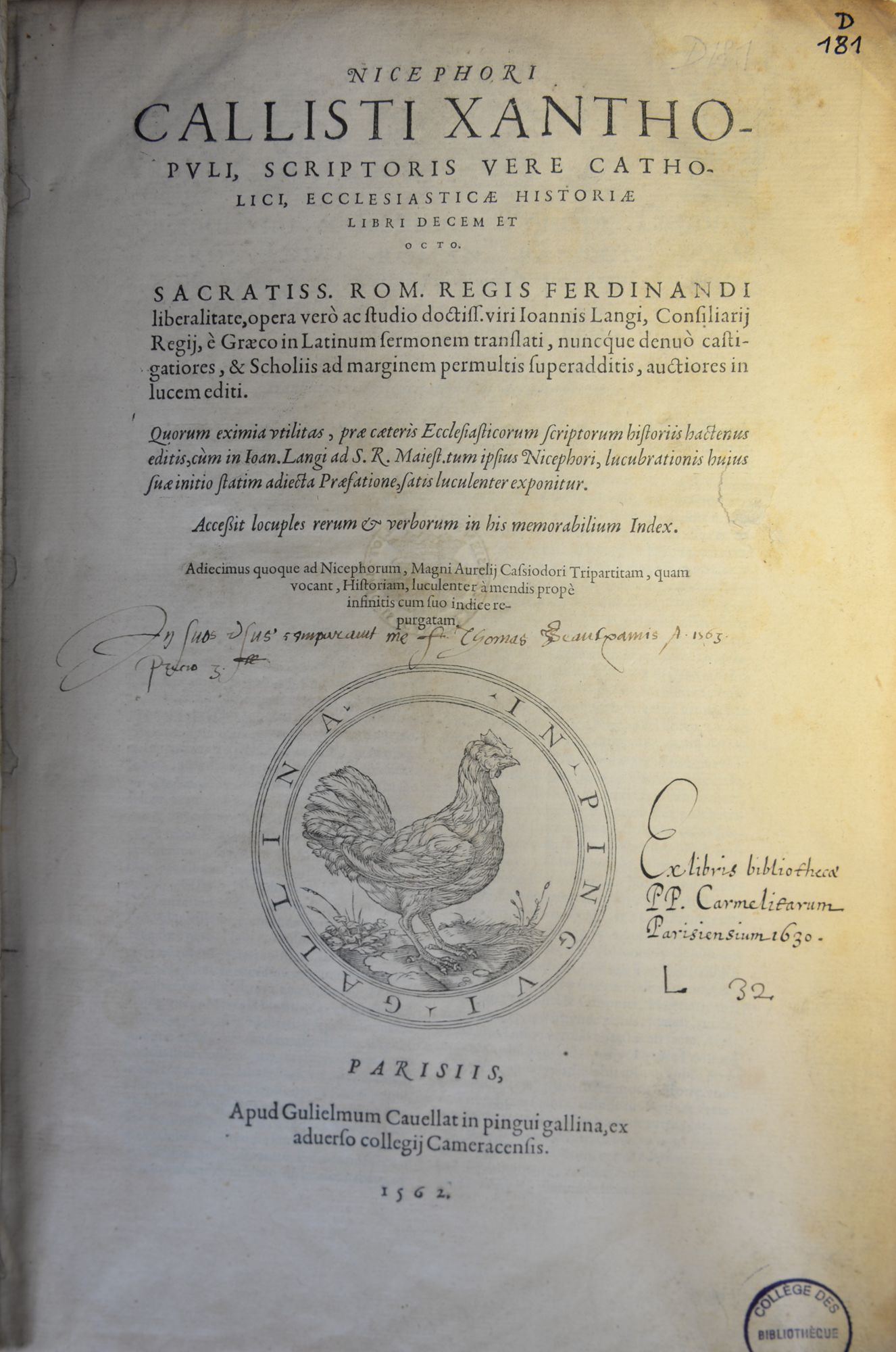 However, this overall coherence both in terms of theme and provenance should not lead us to overlook other past owners of the books now kept in the collection. Some copies were owned by well-known contemporary figures, often themselves authors. Thus we can point to the Latin edition of an ecclesiastical history owned by Thomas Beauxamis, one of the most prolific French polemicists and theologians of the 16th century.