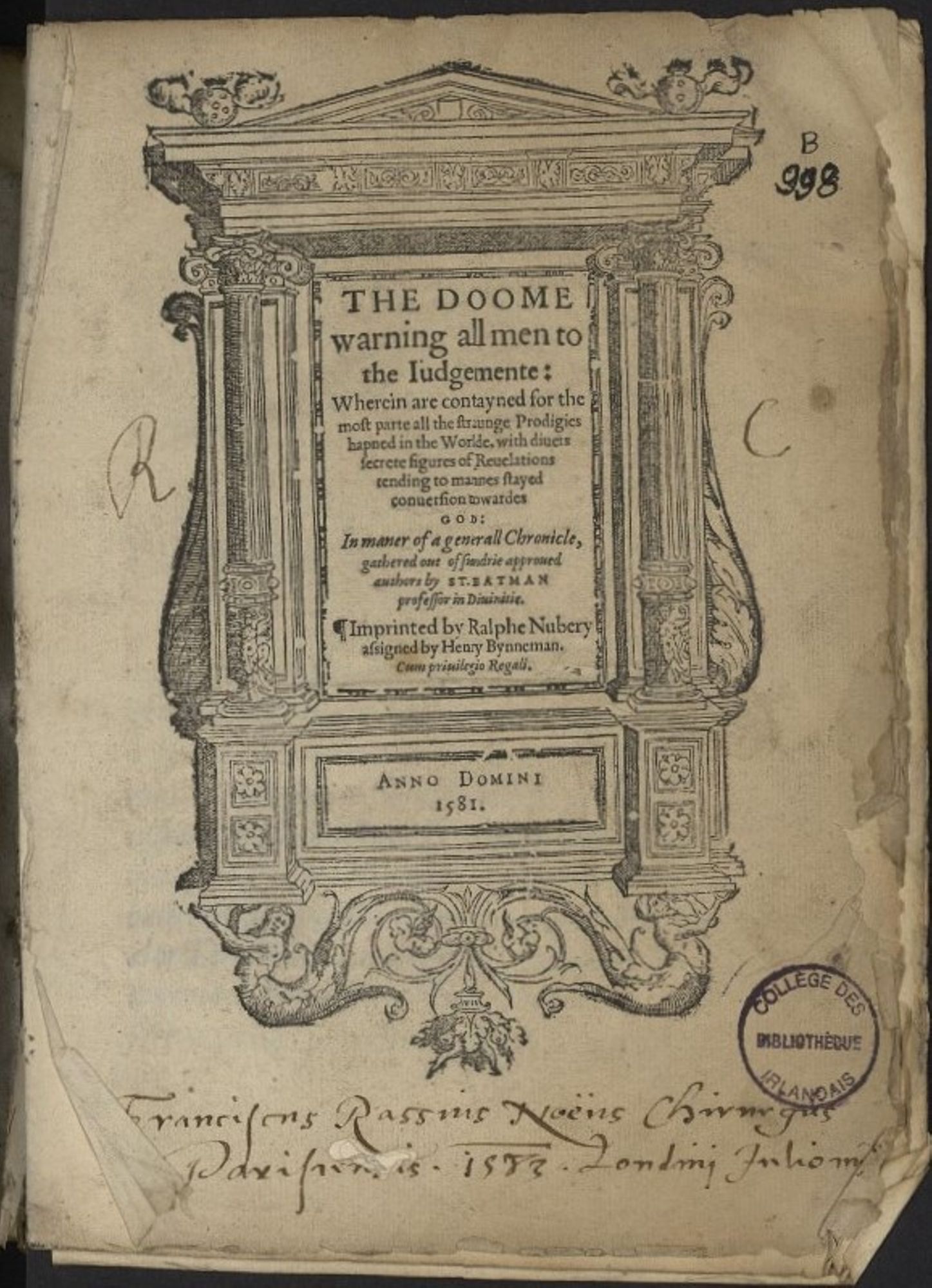 K. Lykosthenes, The doome warning all men to the judgemente, London: Henry Bynneman, 1581, USTC 509327 – B 998.