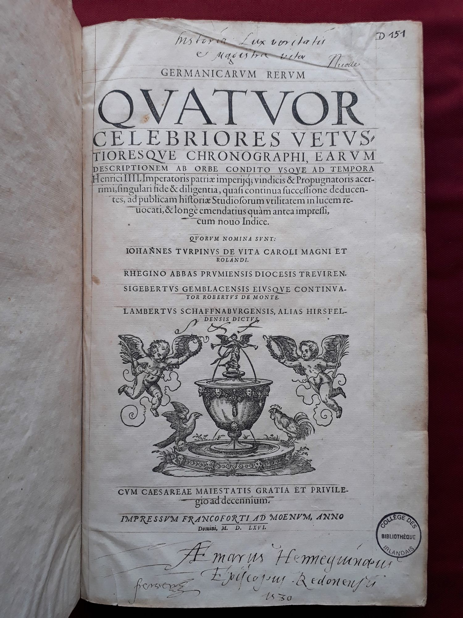 Aymar Hennequin, bishop of Rennes, was one of Henry IV’s main opponents prior to his conversion to Catholicism. However, his intellect made him an inescapable figure of late 16th-century France and the king appointed him archbishop of Reims in 1594. This book illustrates his love of history as he added a handwritten annotation paraphrasing Cicero: “Historia lux veritatis et magistra vitae” (History, light of truth and mistress).