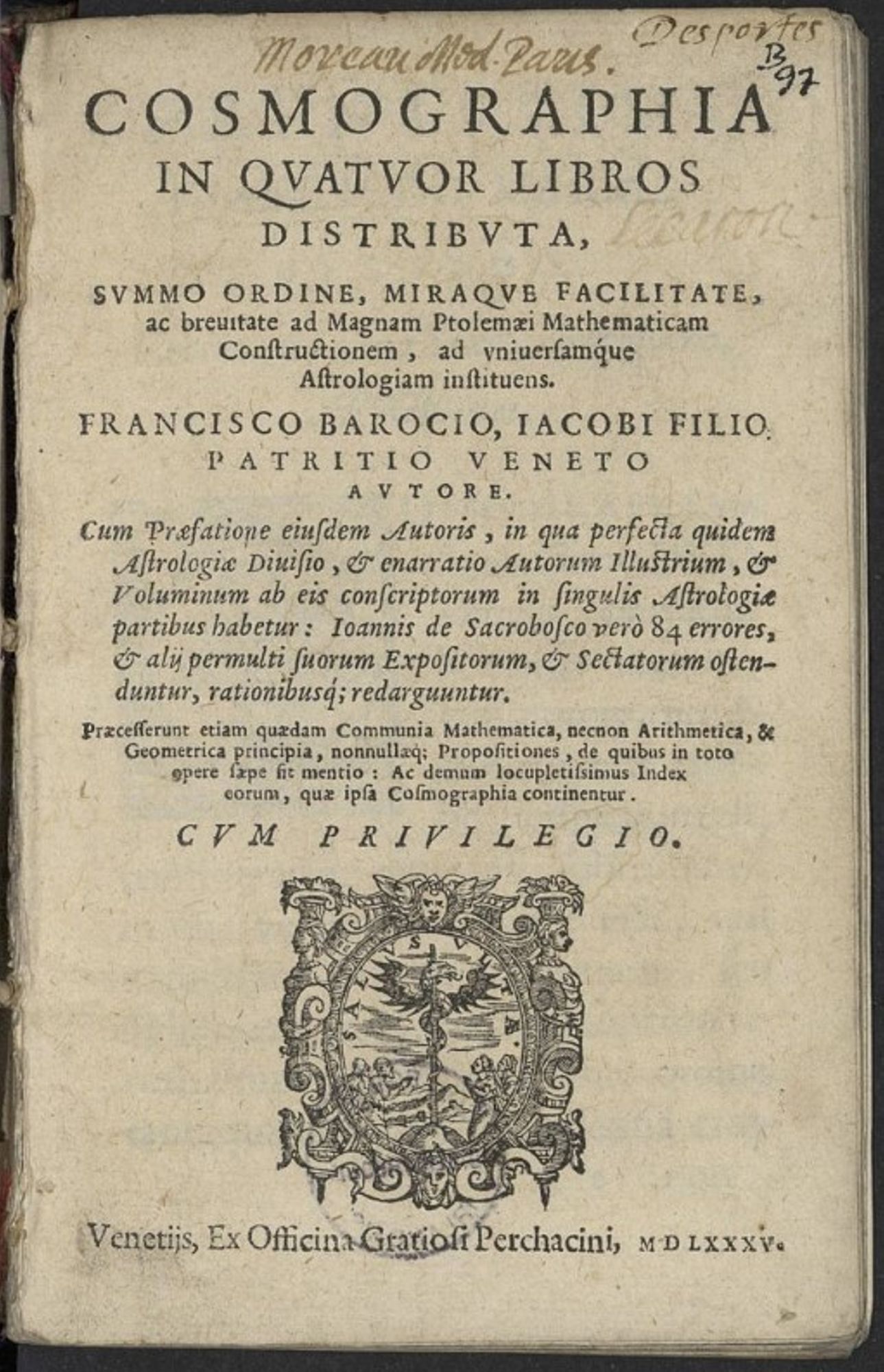 F. Barozzi, Cosmographia in quatuor libros distributa, Venice: Grazioso Percacino, 1585, USTC 812370 – B 97.