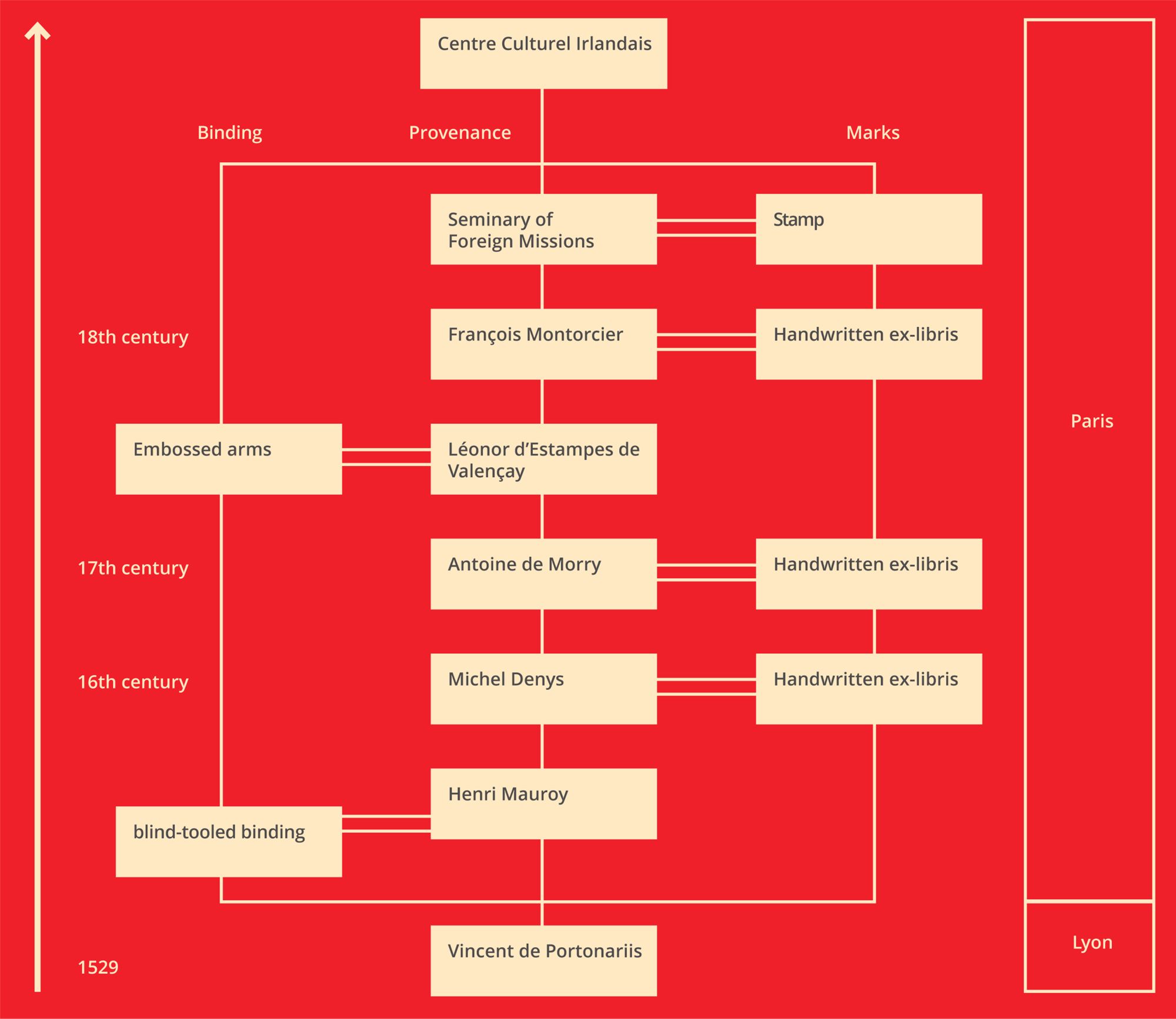 The books that are now preserved in the Centre Culturel Irlandais do not come from the original collection of the Irish seminary, known as the « Collège des Irlandais », at the end of the Ancien Régime. That library was seized during the French Revolution and dispersed.