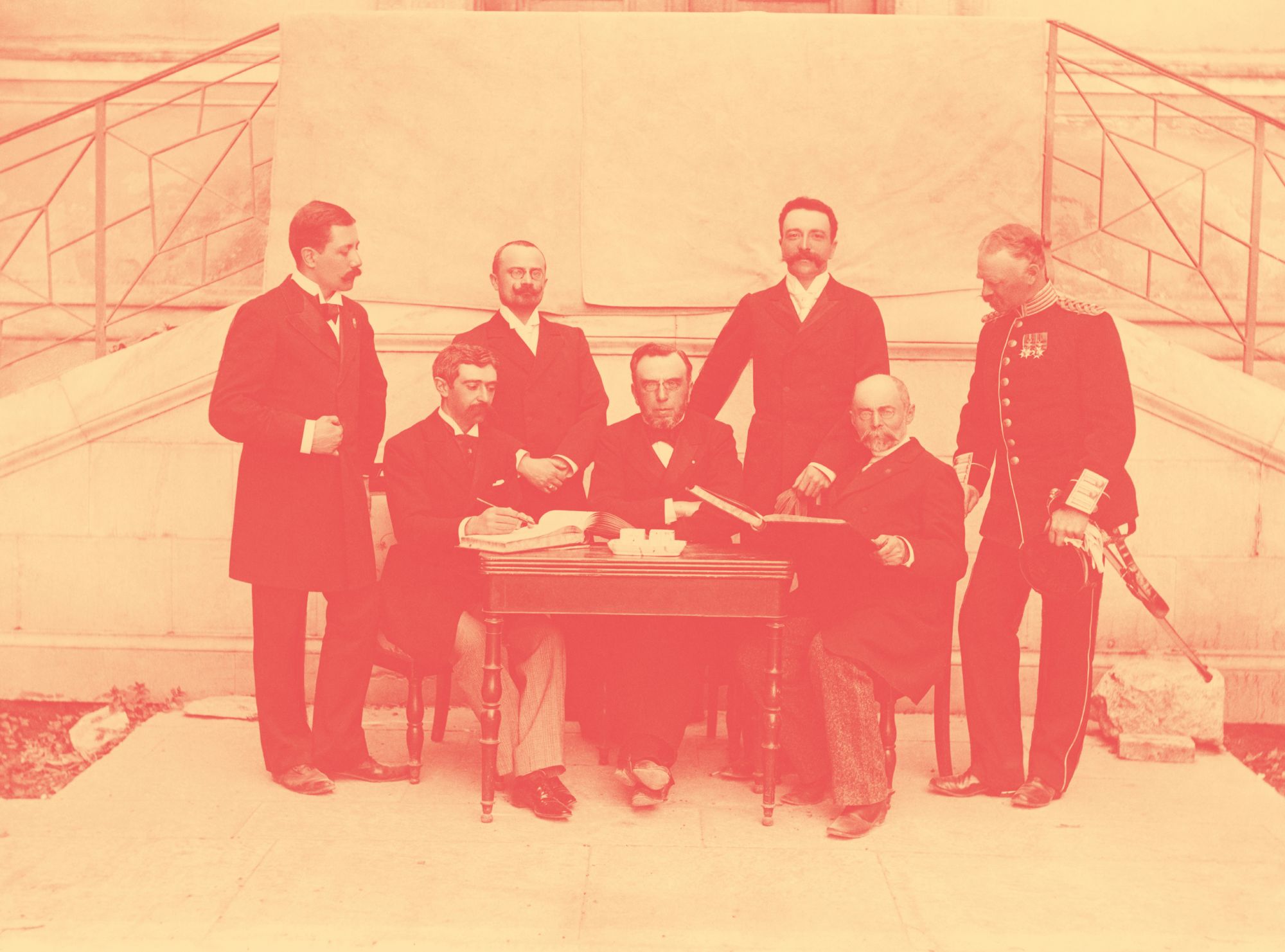 From left to right, sitting: Pierre de Coubertin, Demetrius Vikelas, and Aleksey Dimitrievic Boutowski; standing: Karl August Willibald Gebhardt, Jiri Guth-Jarkovsky, Ferenc Kemeny and Viktor Gustav Black