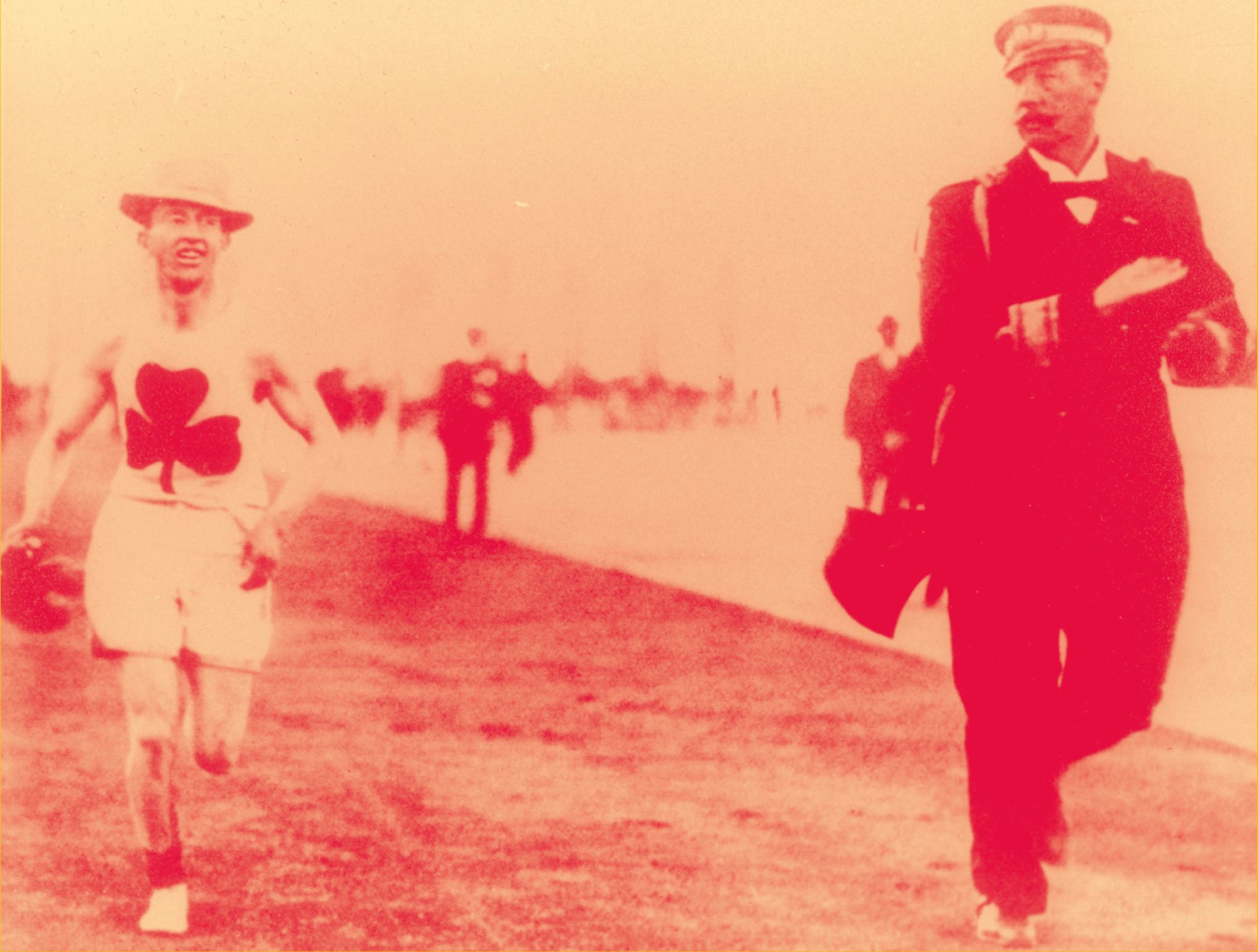 Prince George of Greece (right) ran the last 50 metres alongside him. Sherring was a son of Irish parents and a member of the St. Patrick’s Athletic Club in Hamilton, Ontario, whose singlet emblem was a large shamrock.